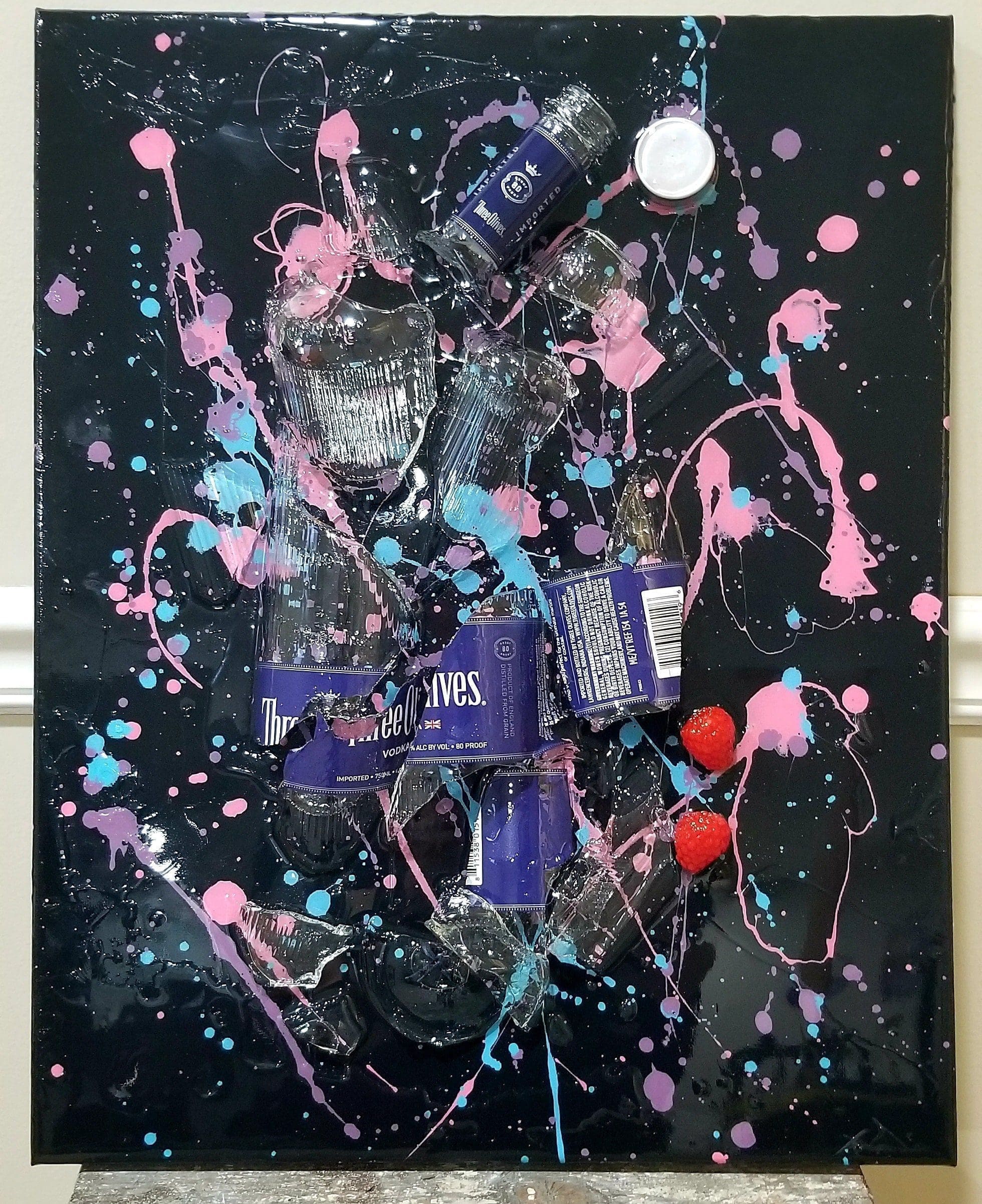 “Radiant Raspberry Refinement: A Broken Vodka Symphony” presents a captivating tableau of sophistication and whimsy, where the shattered remnants of a Three Olives vodka bottle intertwine with the luscious allure of artificial raspberries upon a canvas veiled in resin.