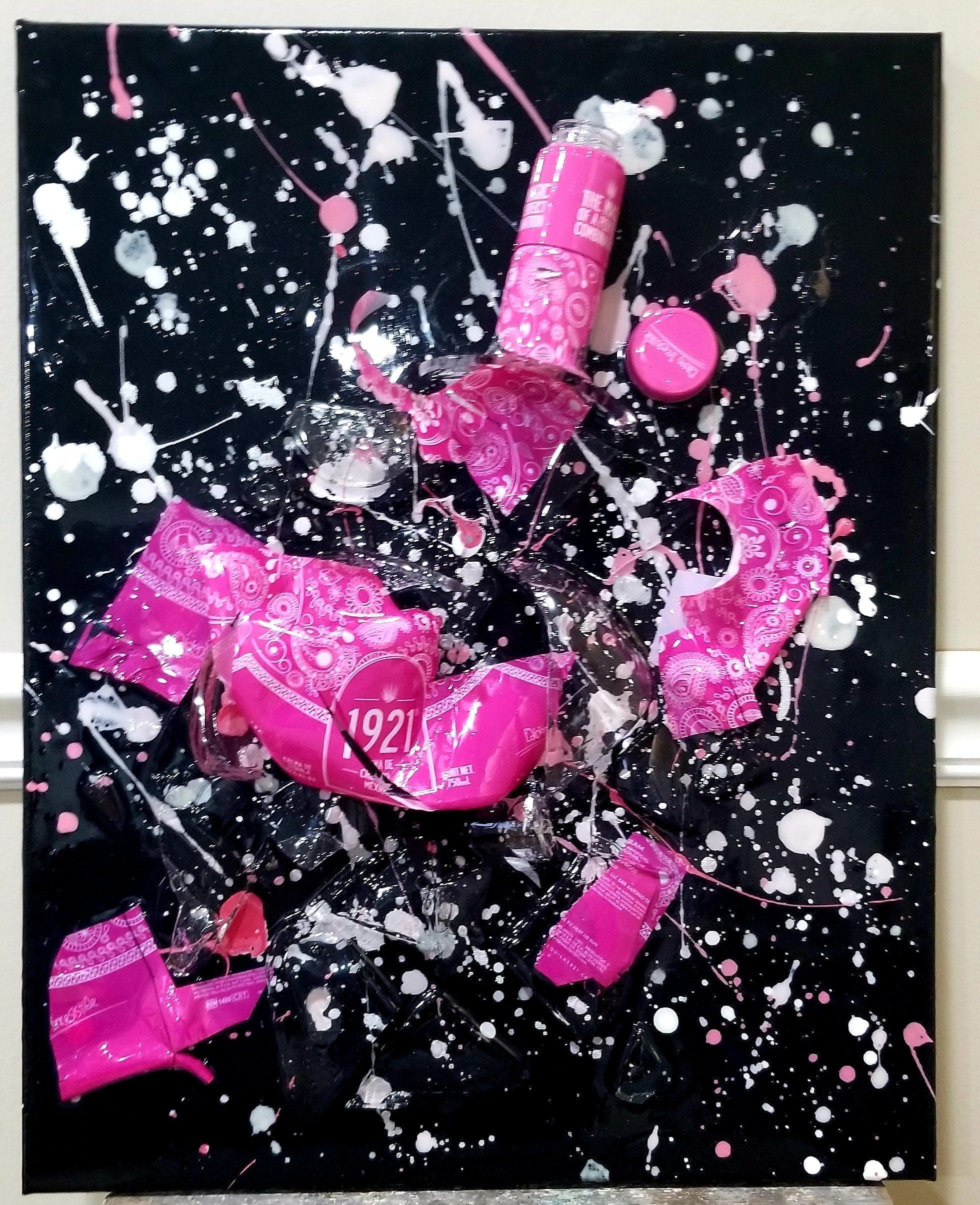 The 16 x 20 black stretched canvas has been splatter painted using pink, white, and silver acrylic paint, to match the bottle. The bottle and lid have been carefully laid across the canvas. The entire piece was then covered in art resin. This is truly a rare piece!