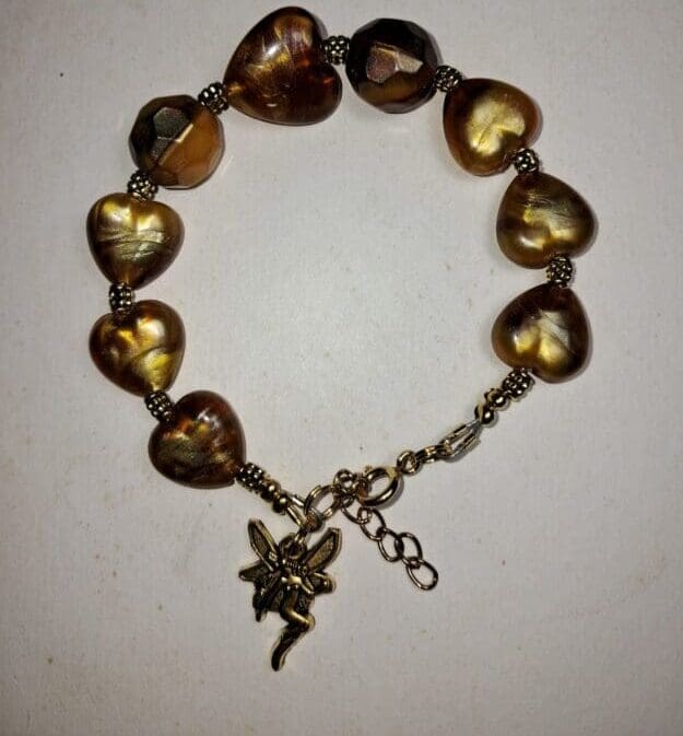 This enchanting bracelet is made with glossy acrylic heart beads in warm golden and bronze tones, each bead catching the light with a soft, pearly glow. Gold-tone spacer beads add texture and elegance between the hearts, while a charming fairy pendant brings a magical, storybook touch.