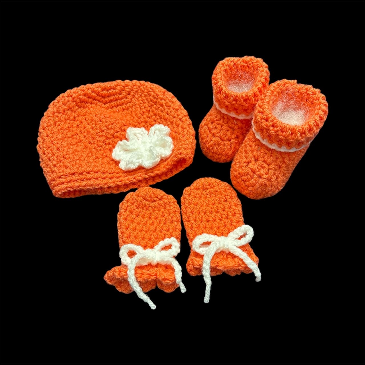 Adorable Crochet 3 Piece Baby Set Size 0-6 Months Welcome your little one with the warmth and softness of this handcrafted crocheted Baby outfit. Outfit is lightweight and breathable, making them ideal for sensitive baby skin. This charming hat is perfect for photoshoots, or as a thoughtful baby shower gift. Made with soft, baby-safe yarn, this adorable hat is designed to keep your baby cozy and comfortable