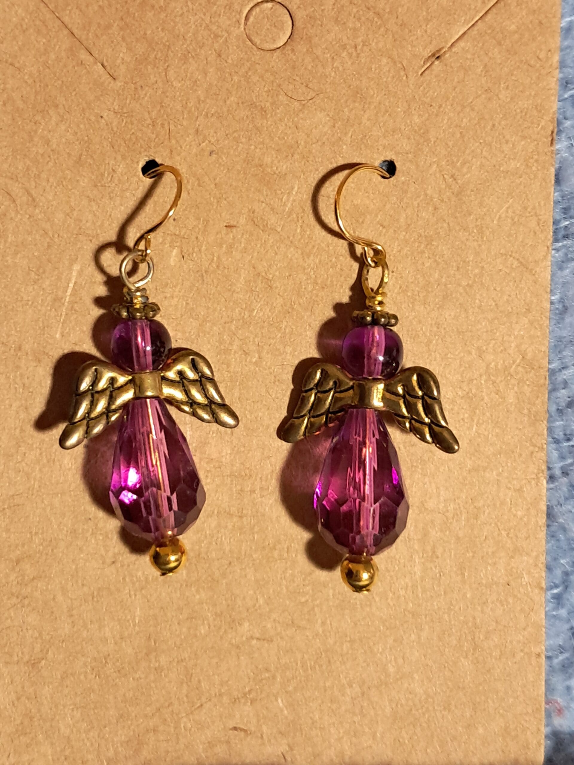 The angels hang from elegant gold-plated ear wires, offering both durability and a soft golden glow that complements the rich purple tones perfectly. A tiny polished gold bead at the base adds the finishing touch, enhancing the overall shimmer and flow.