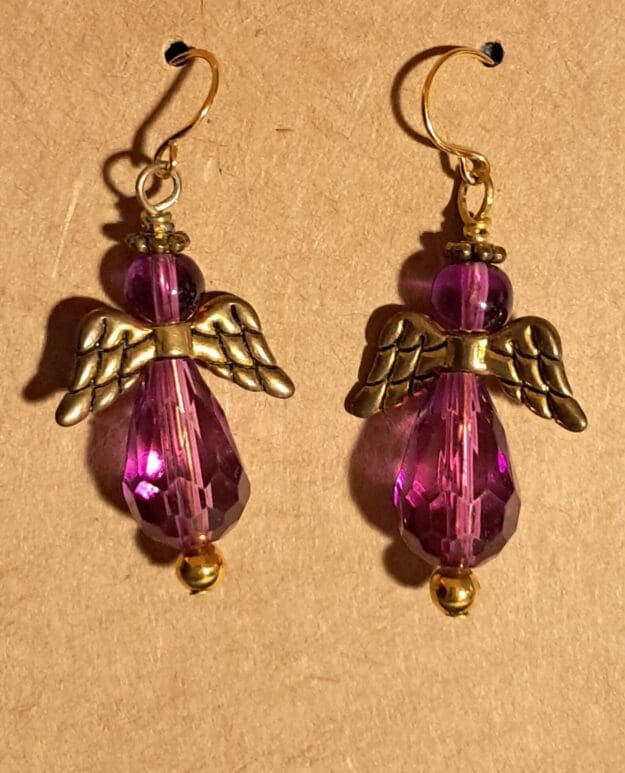 Sweet and uplifting angel earrings handcrafted with faceted amethyst-colored beads, antiqued gold-tone wings, and gold-plated ear wires—perfect for holidays, memorial gifts, or everyday inspiration. Wear them to add a gentle, uplifting presence to any outfit—or gift them to someone who could use a little sparkle and encouragement.