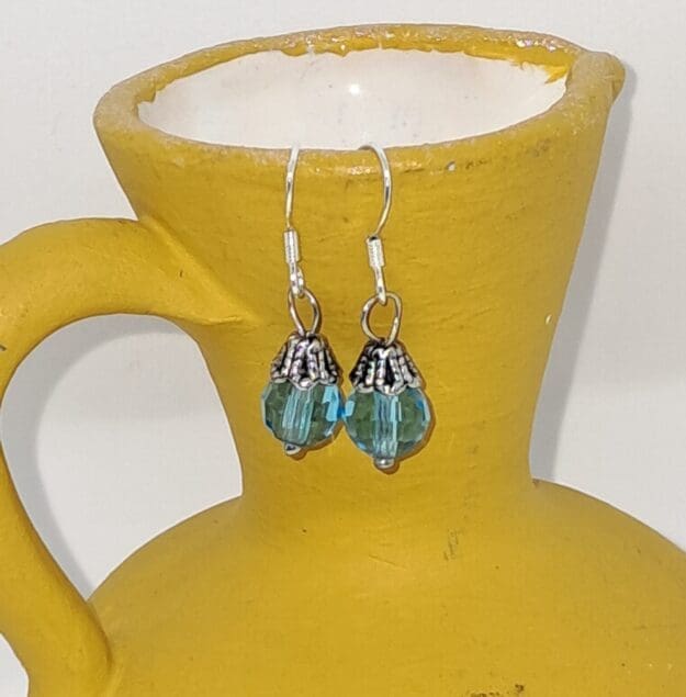 Elegant aqua-blue drop earrings with faceted beads and silver floral caps — lightweight, versatile, and perfect for everyday wear or special occasions.