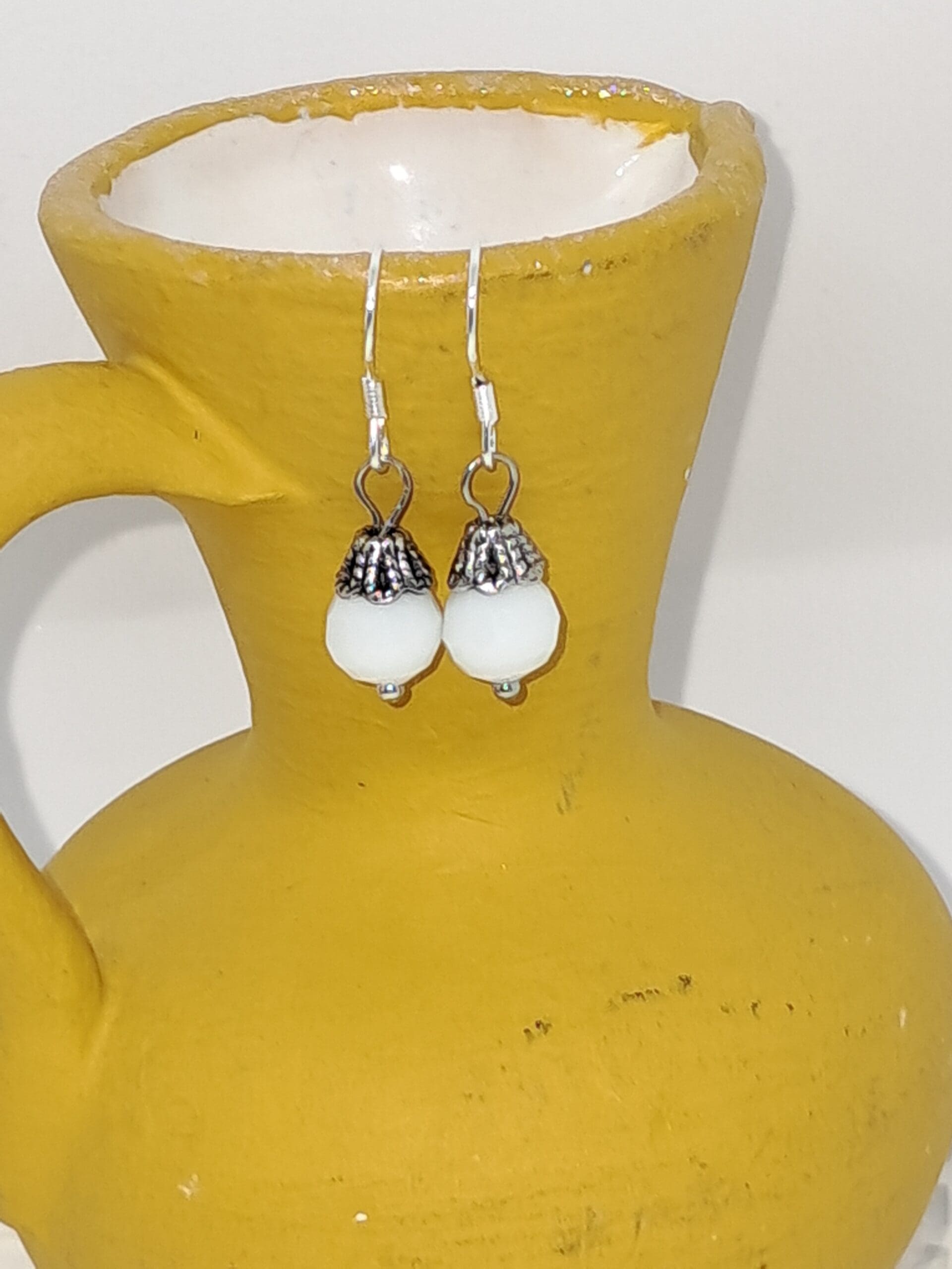 Handmade white bead earrings topped with silver accents — timeless style made easy.