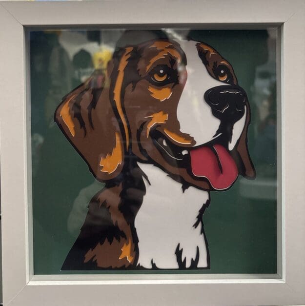 This handmade beagle dog wall art is thoughtfully created to capture the friendly expression and unmistakable charm of this beloved breed. Crafted using layered paper art techniques, this framed beagle portrait is built from multiple precision cut paper layers that create depth, texture, and visual interest. Each layer is carefully assembled by hand to highlight the beagle’s soulful eyes, floppy ears, and playful personality.