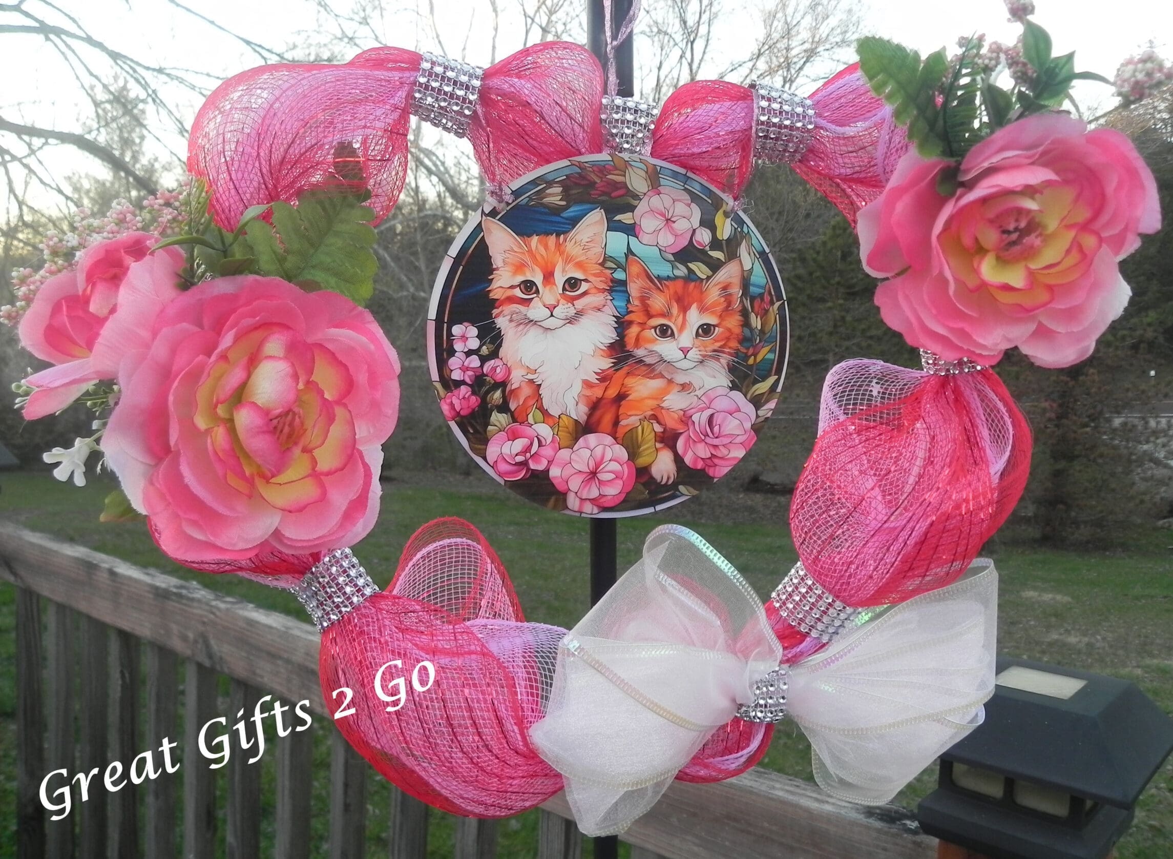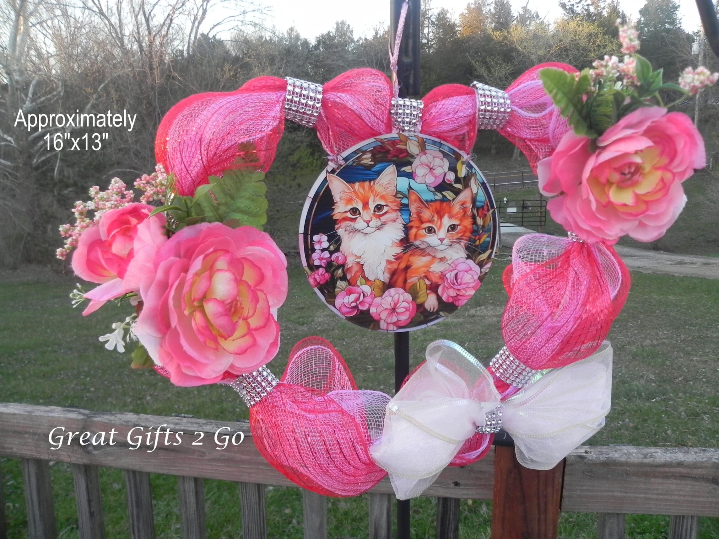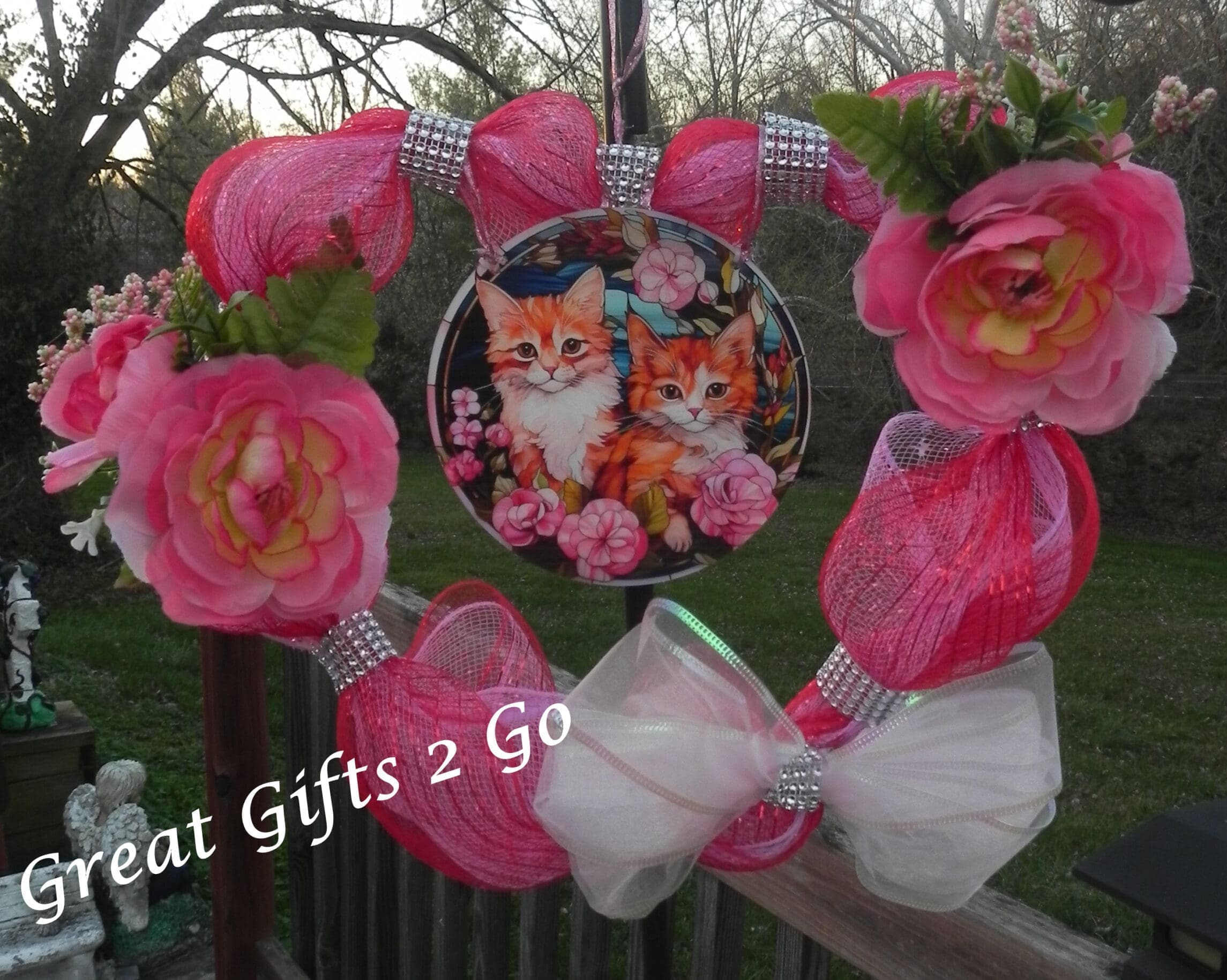 Adorable handmade wreath featuring two kittens pretty in pink.