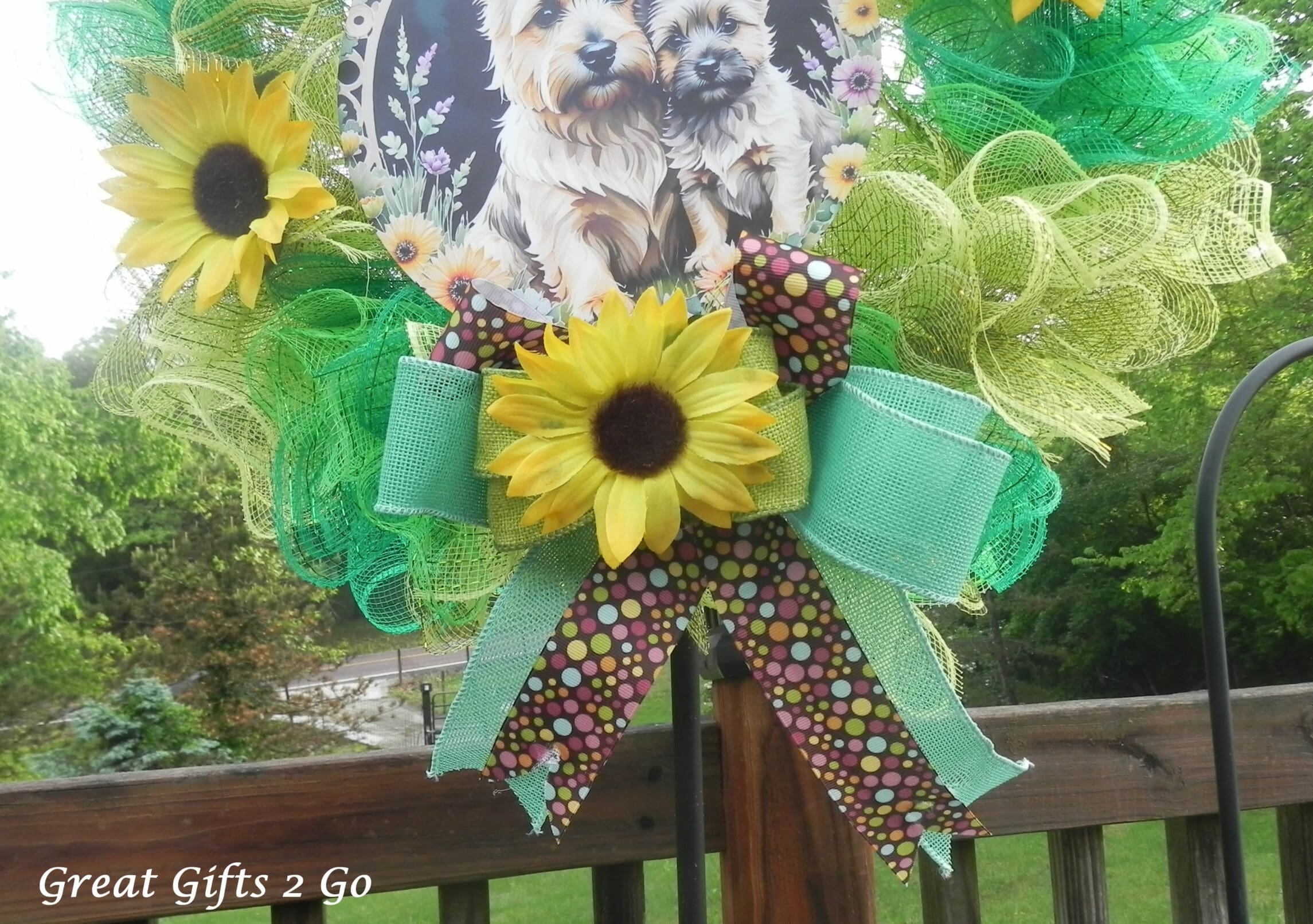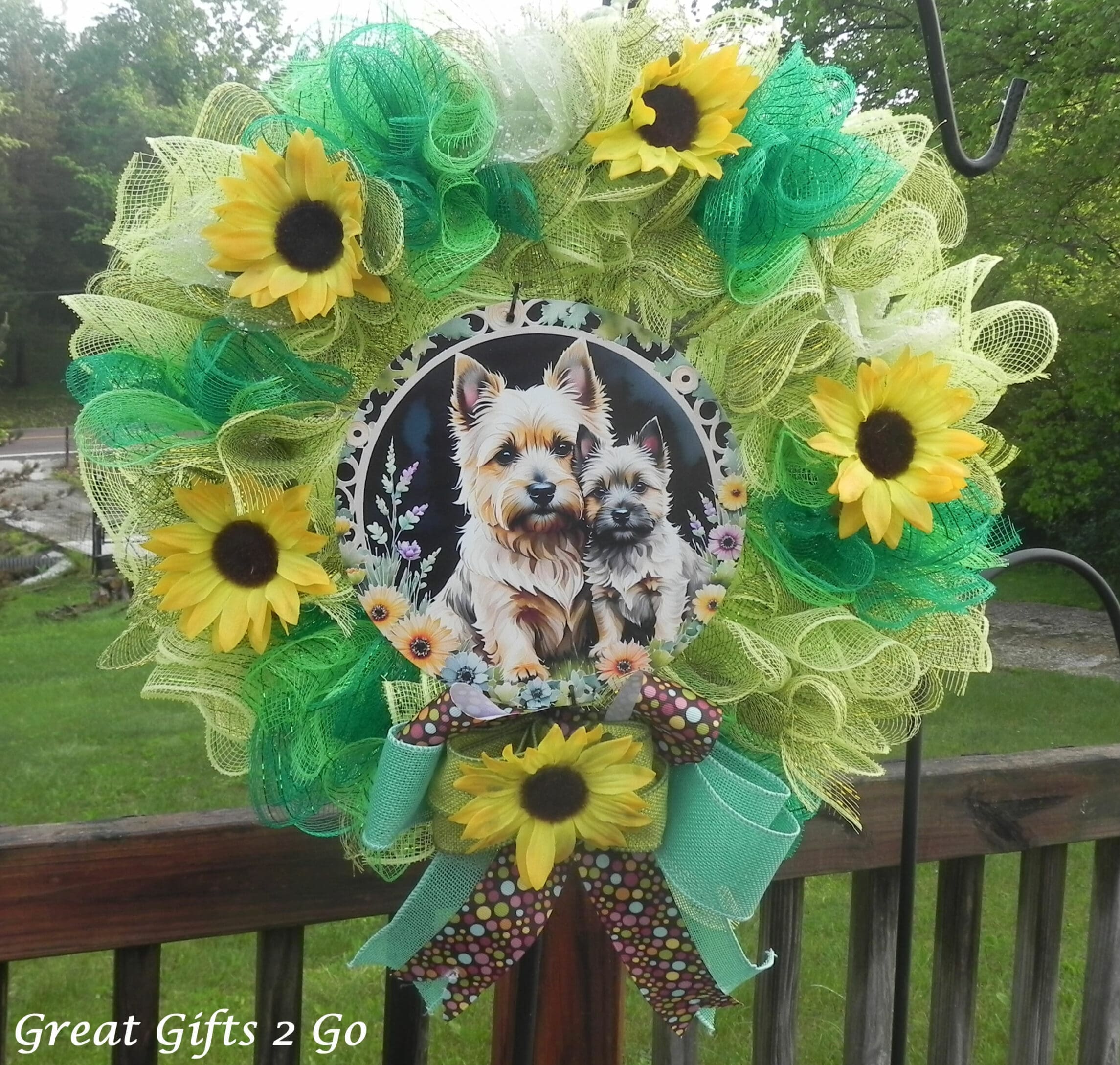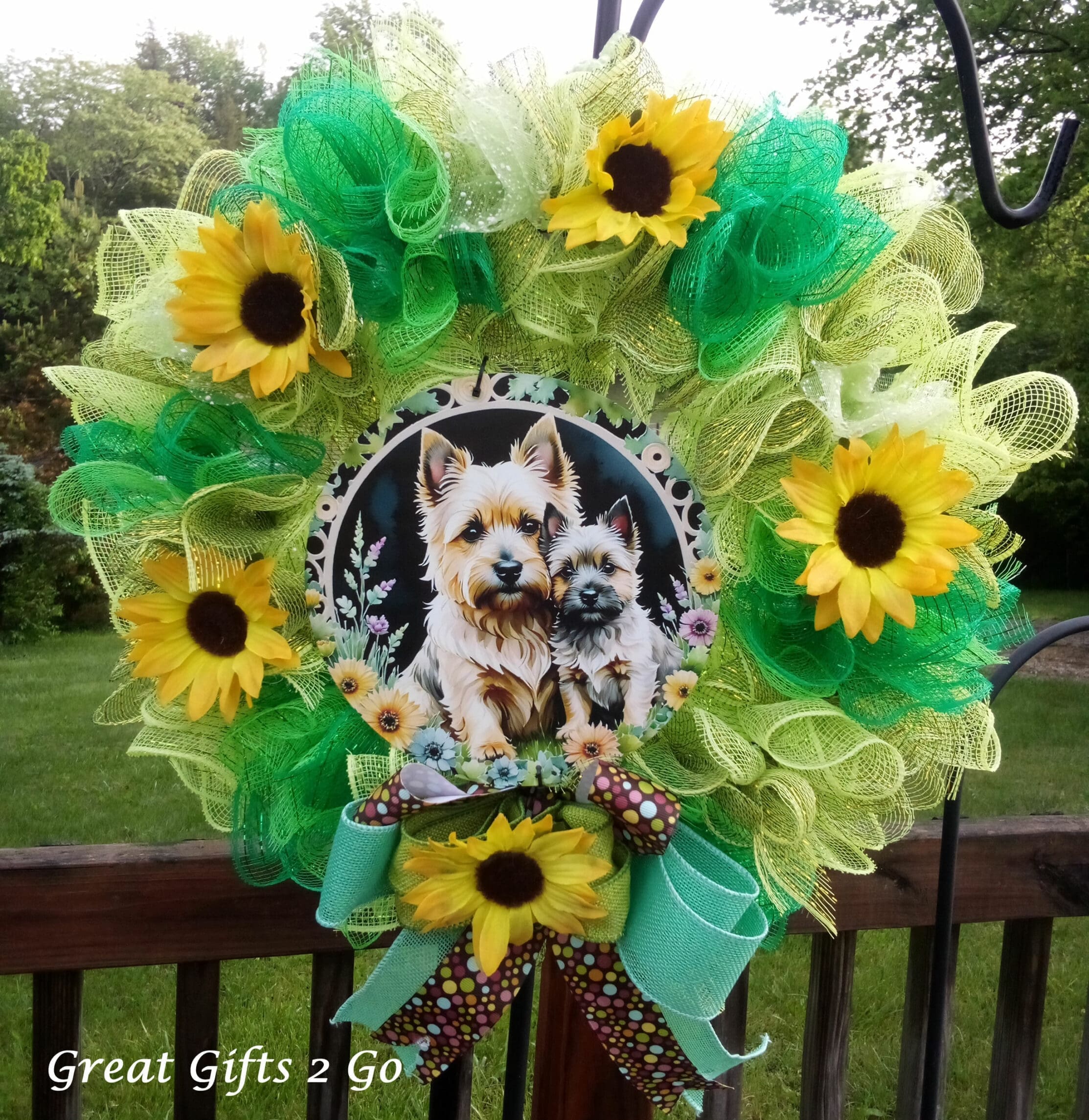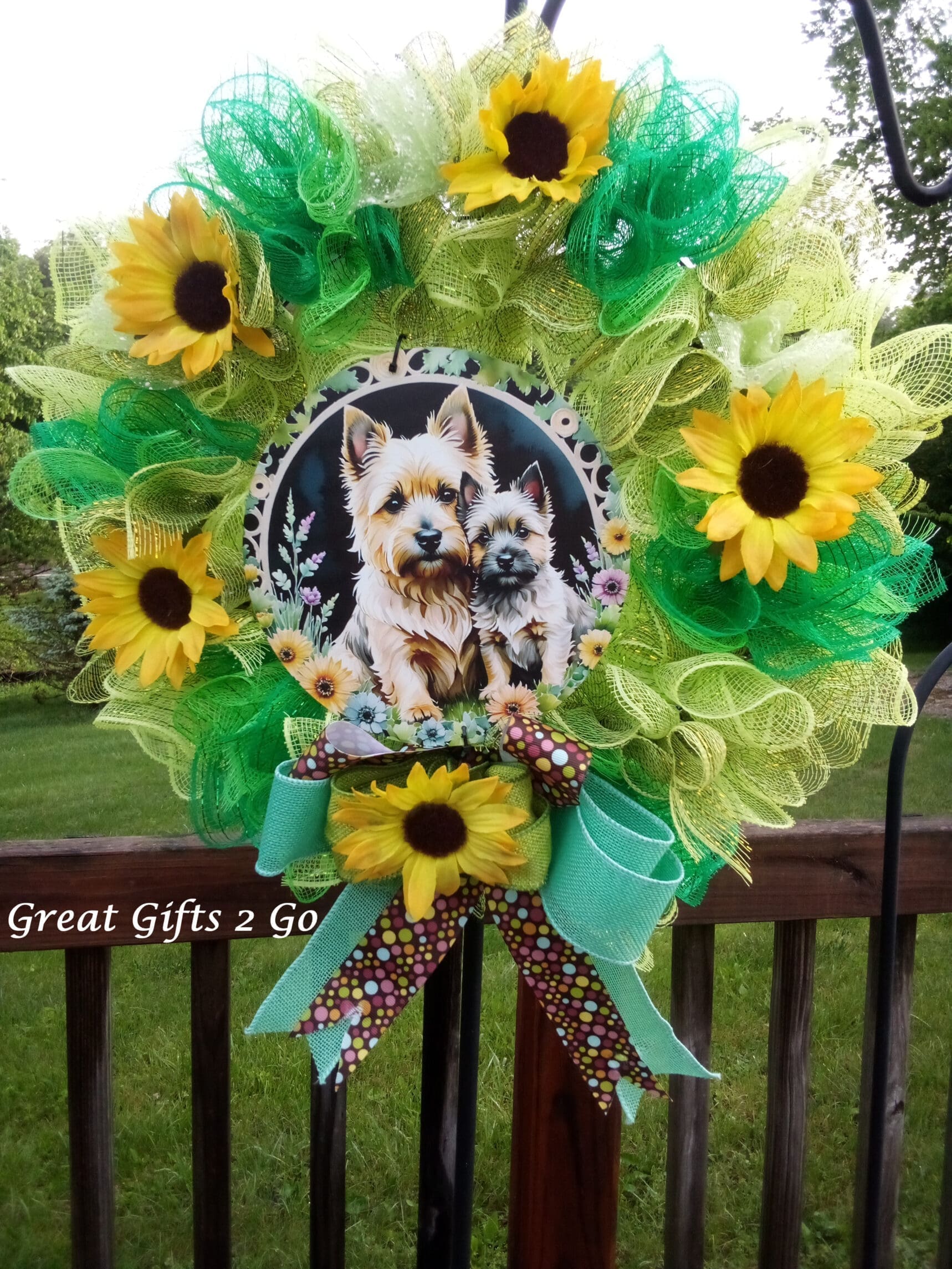 Adorable handmade wreath featuring deco mesh, sunflowers, and two Cairn Terriers in the middle.