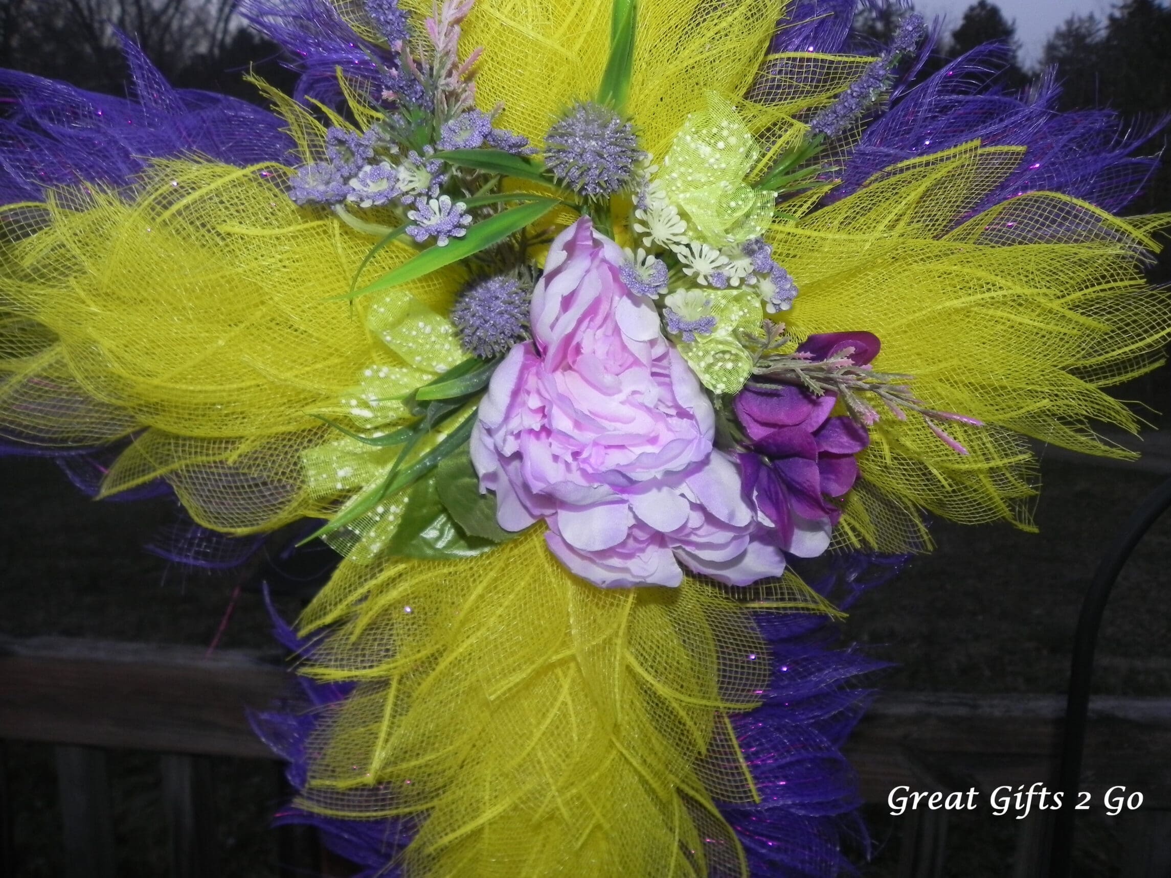 The vivid yellow and purple cross wreath is sensational and ready to hang on your door.