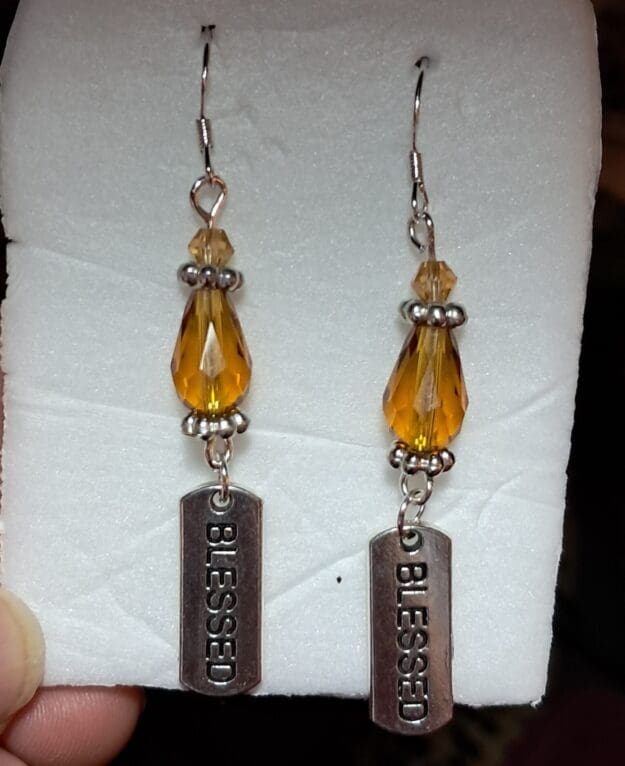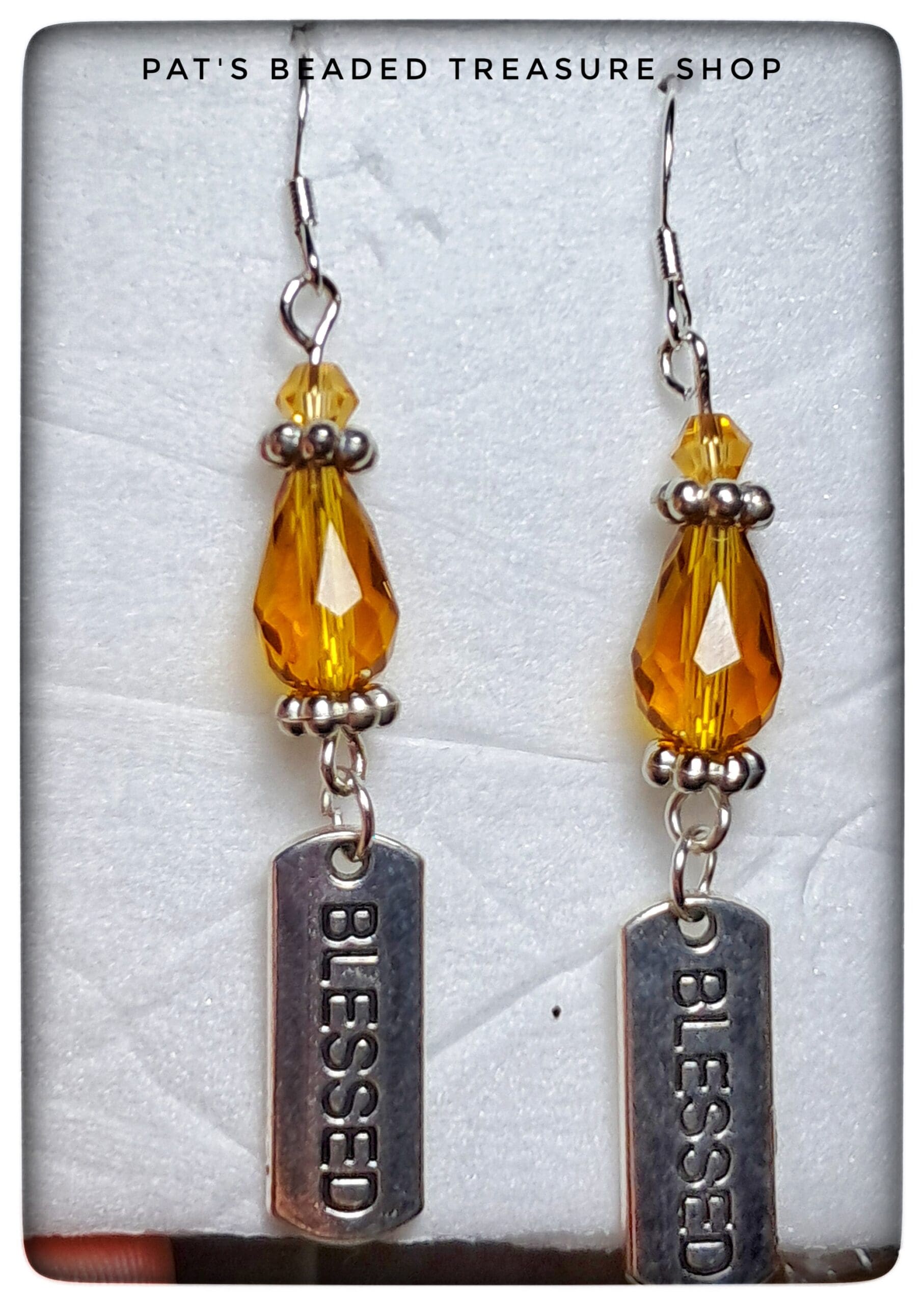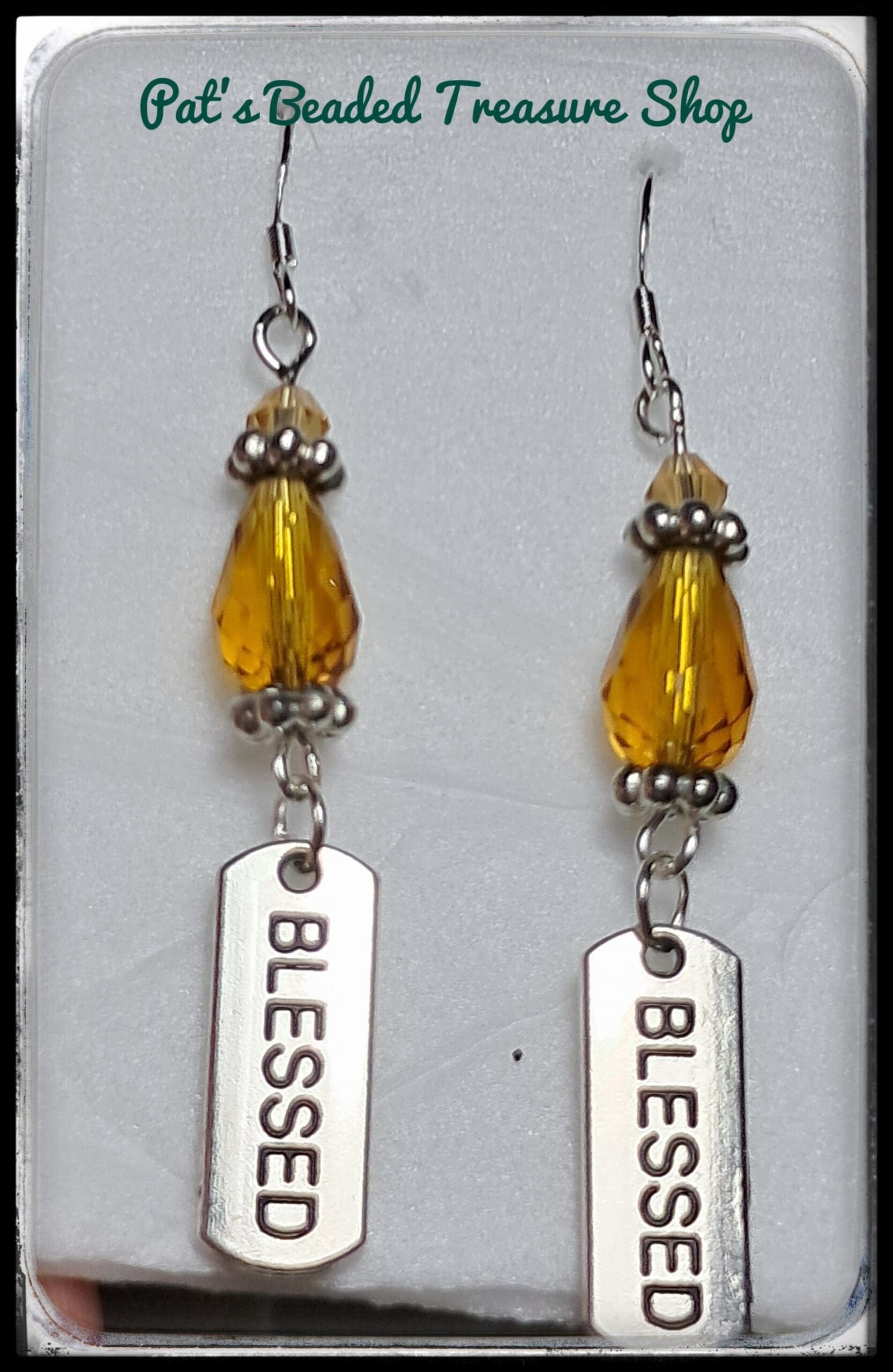 Add a touch of inspiration to your day with these handcrafted faith “Blessed” earrings. The warm amber-colored faceted glass beads sparkle beautifully in the light, accented with detailed silver-tone spacers and a polished charm engraved with the word Blessed.