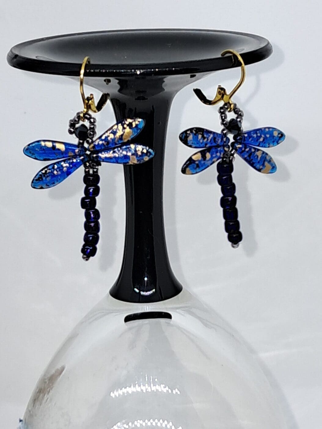 ✨ Whimsical blue & gold dragonfly earrings with shimmering beaded bodies—lightweight, handmade, and perfect for nature lovers. ✨