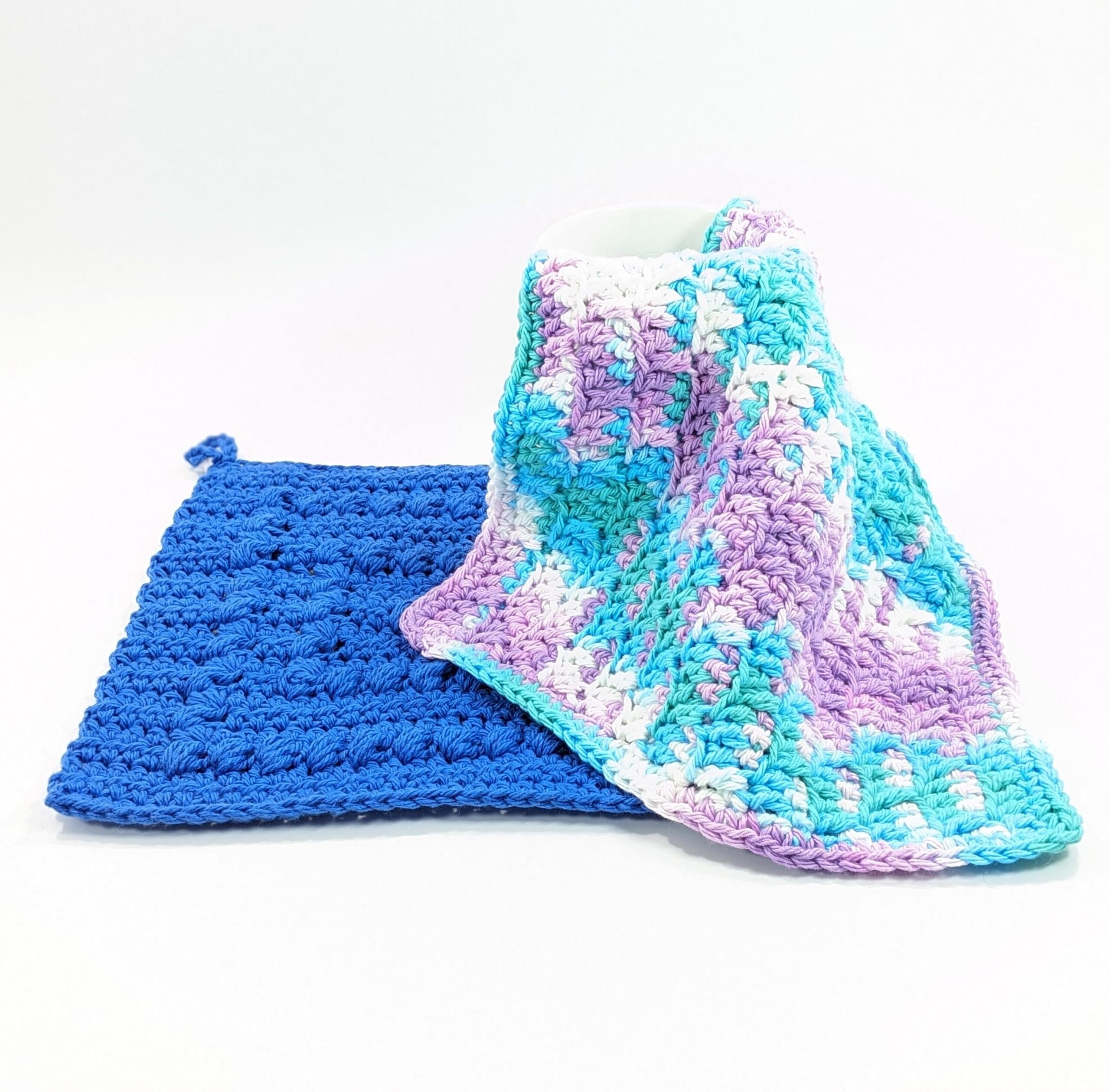 Blue Cotton Multi-Purpose Cloths, You get a set of two cloths 8 by 8 inches square. Also they are made with a sturdy cotton yarn. You can use them to do dishes, clean the bathroom, dust or any job in cleaning. You can machine wash and dry, or just place in the dishwasher.