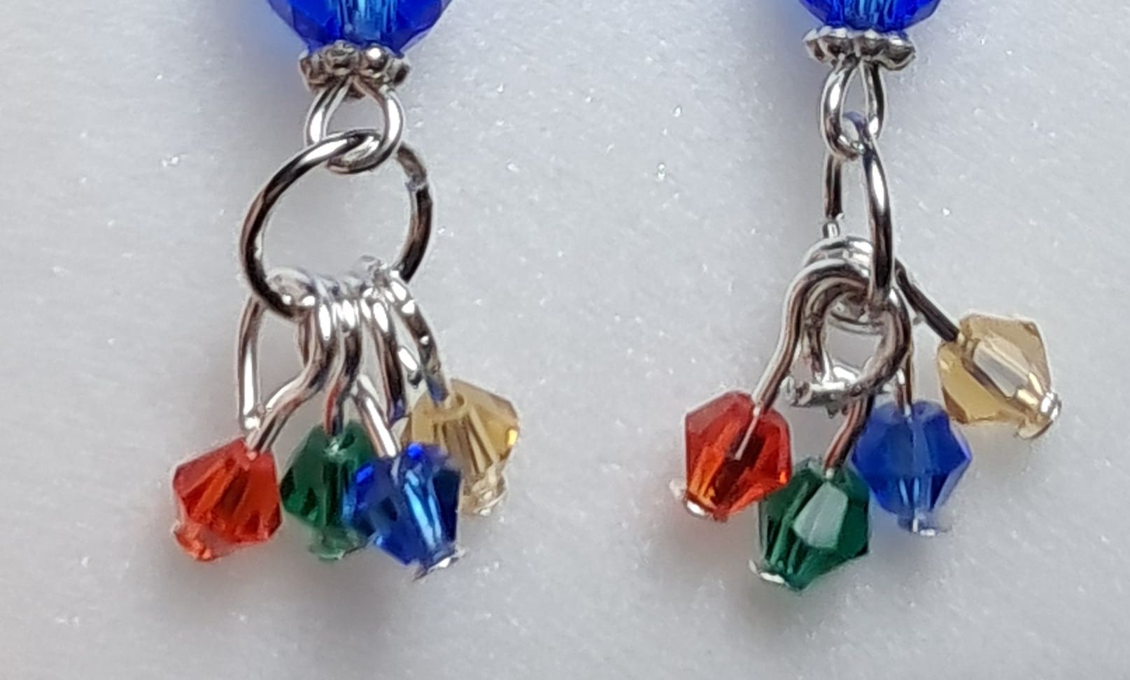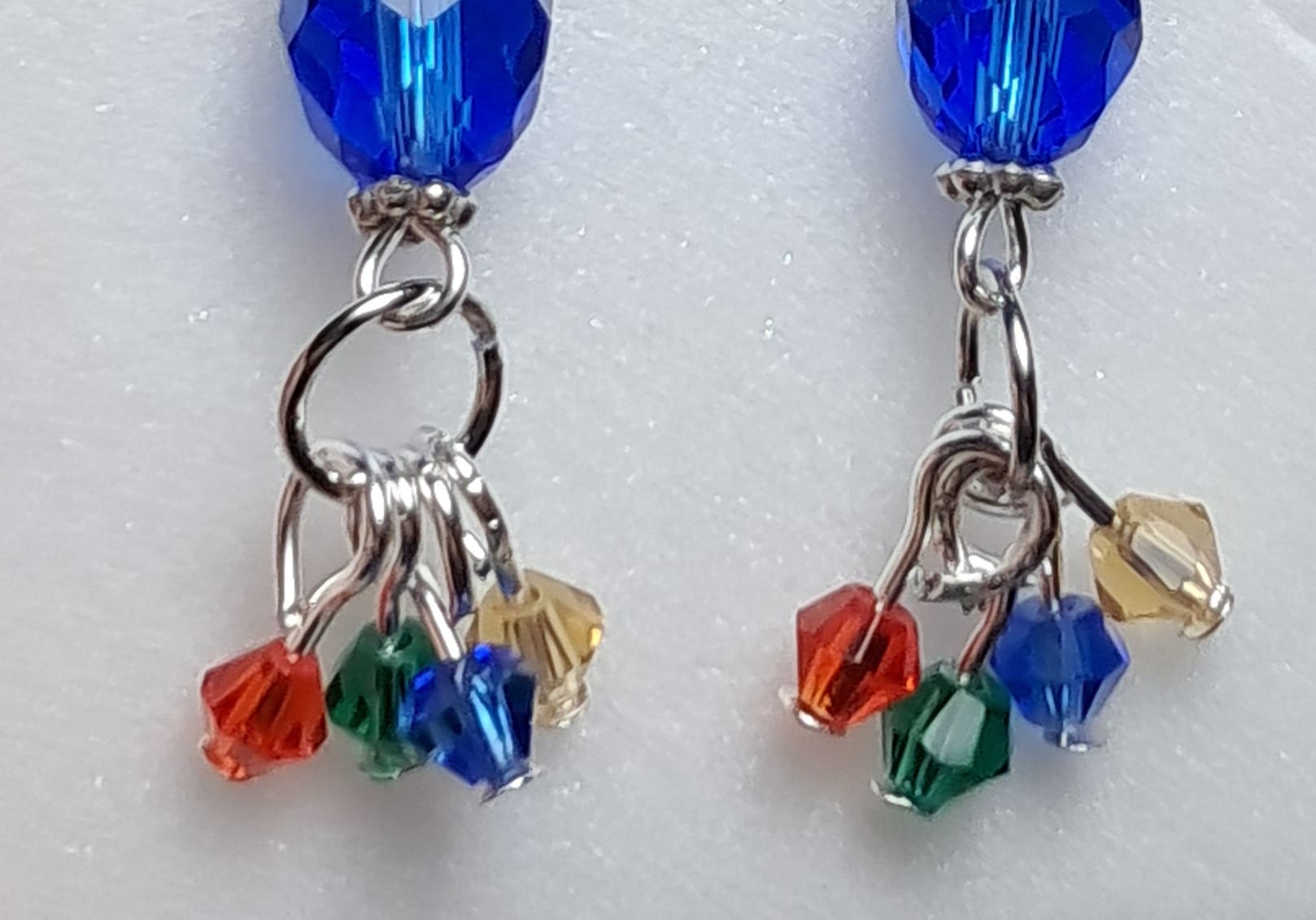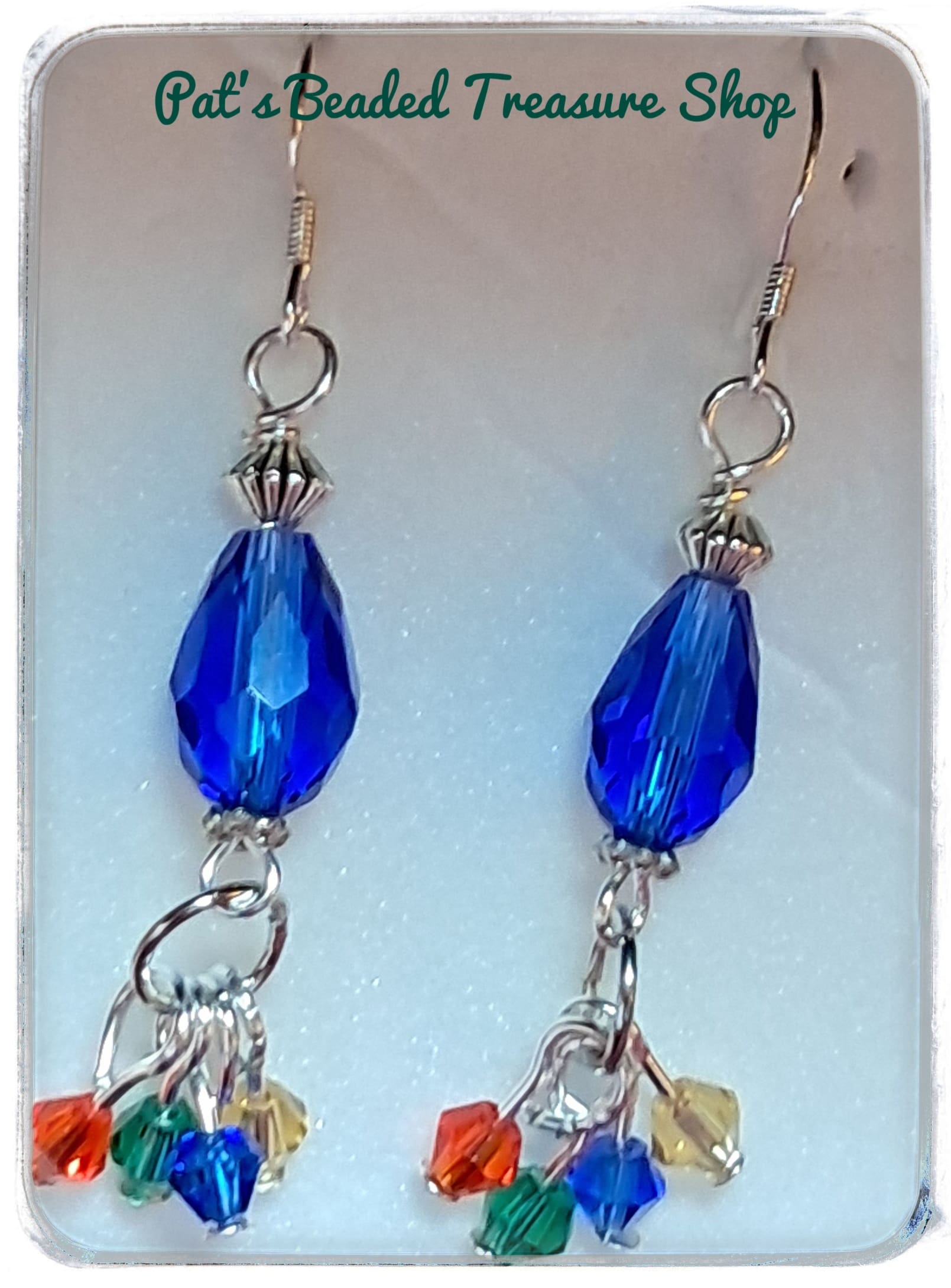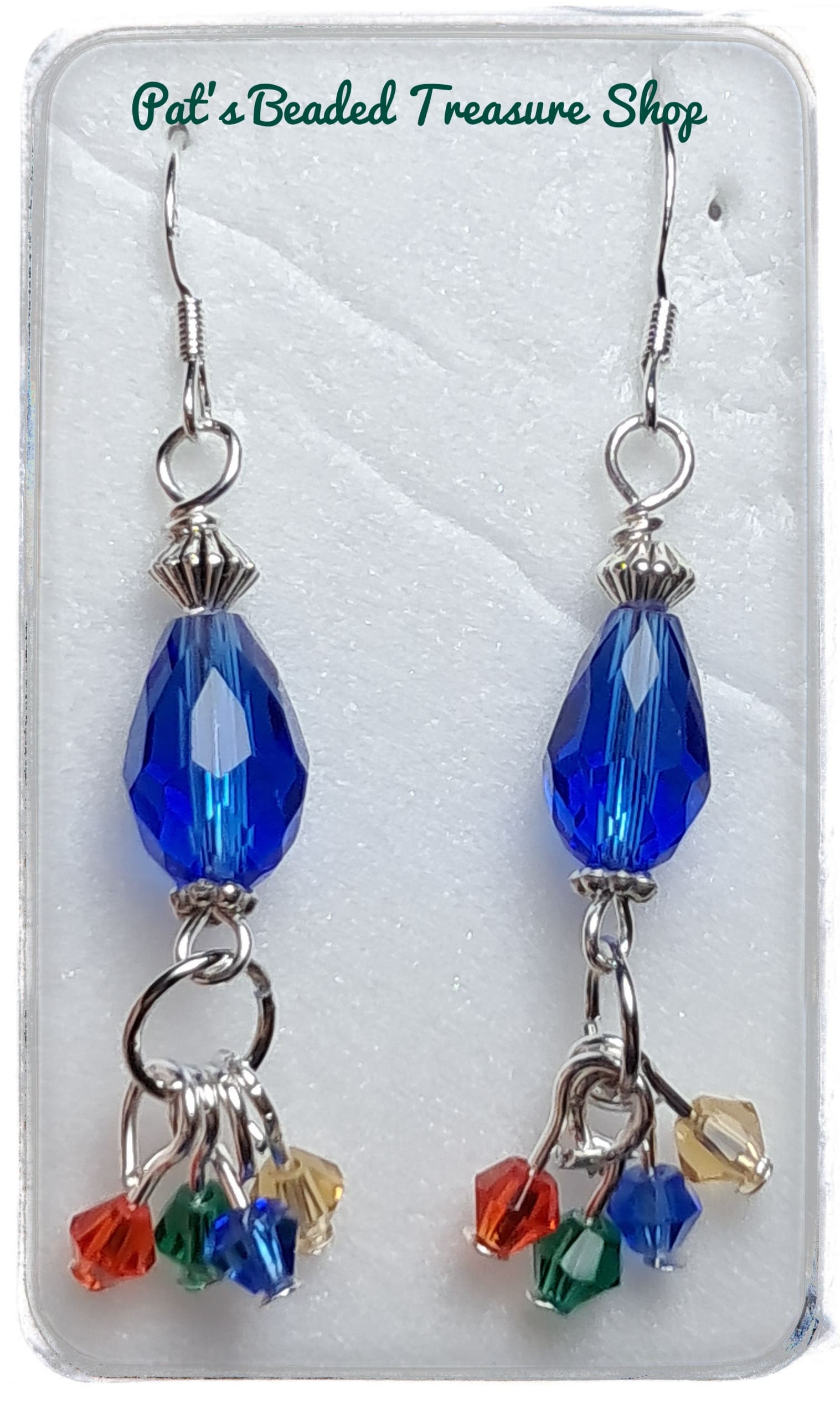 These handmade earrings combine classic blue elegance with playful color. A faceted royal blue crystal bead anchors the design, while small red, green, gold, and blue crystals gently sway below for added sparkle and movement. Finished with 0.925 sterling silver ear wires for comfort and shine.