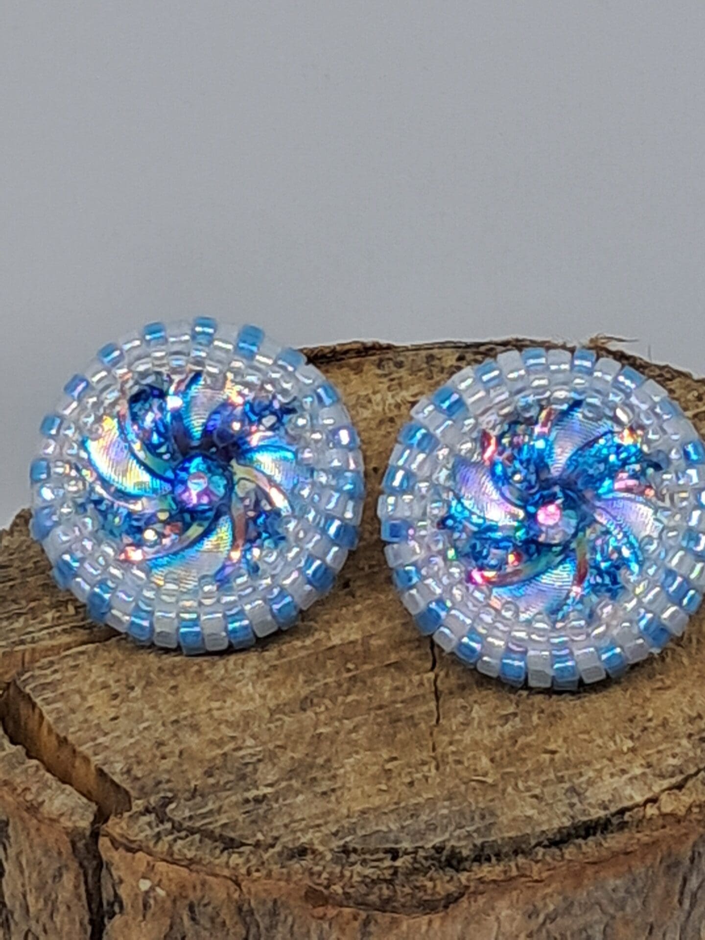 These earrings are round with a clear, iridescent beadwork border and a swirling, multicolored design in the center. The (resin) central design features shades of gold, pink, blue, and red, lilac, creating a visually dynamic effect. The beadwork around the edge adds texture and reflects light, enhancing the overall sparkle of the earrings. The earrings are handmade.