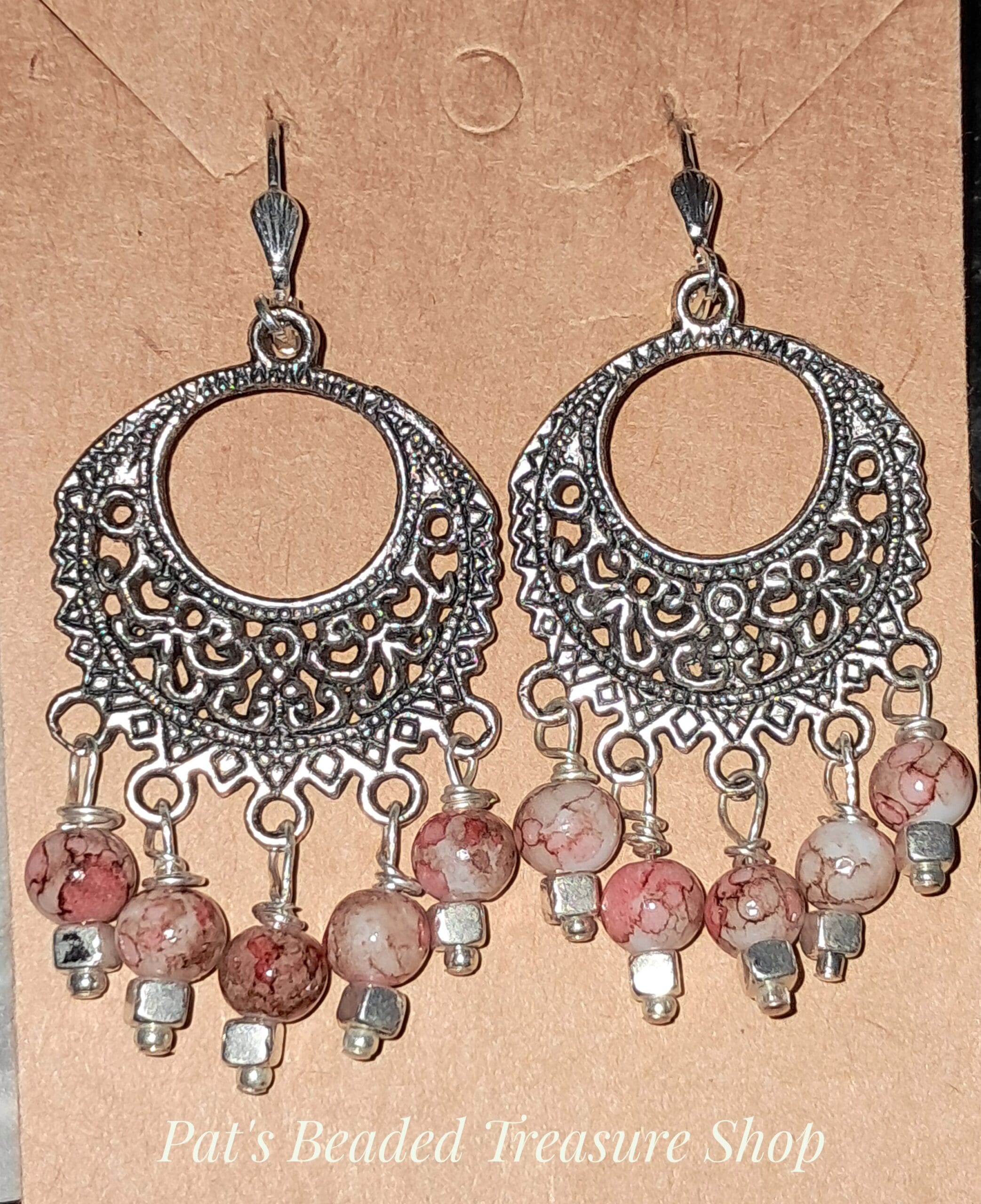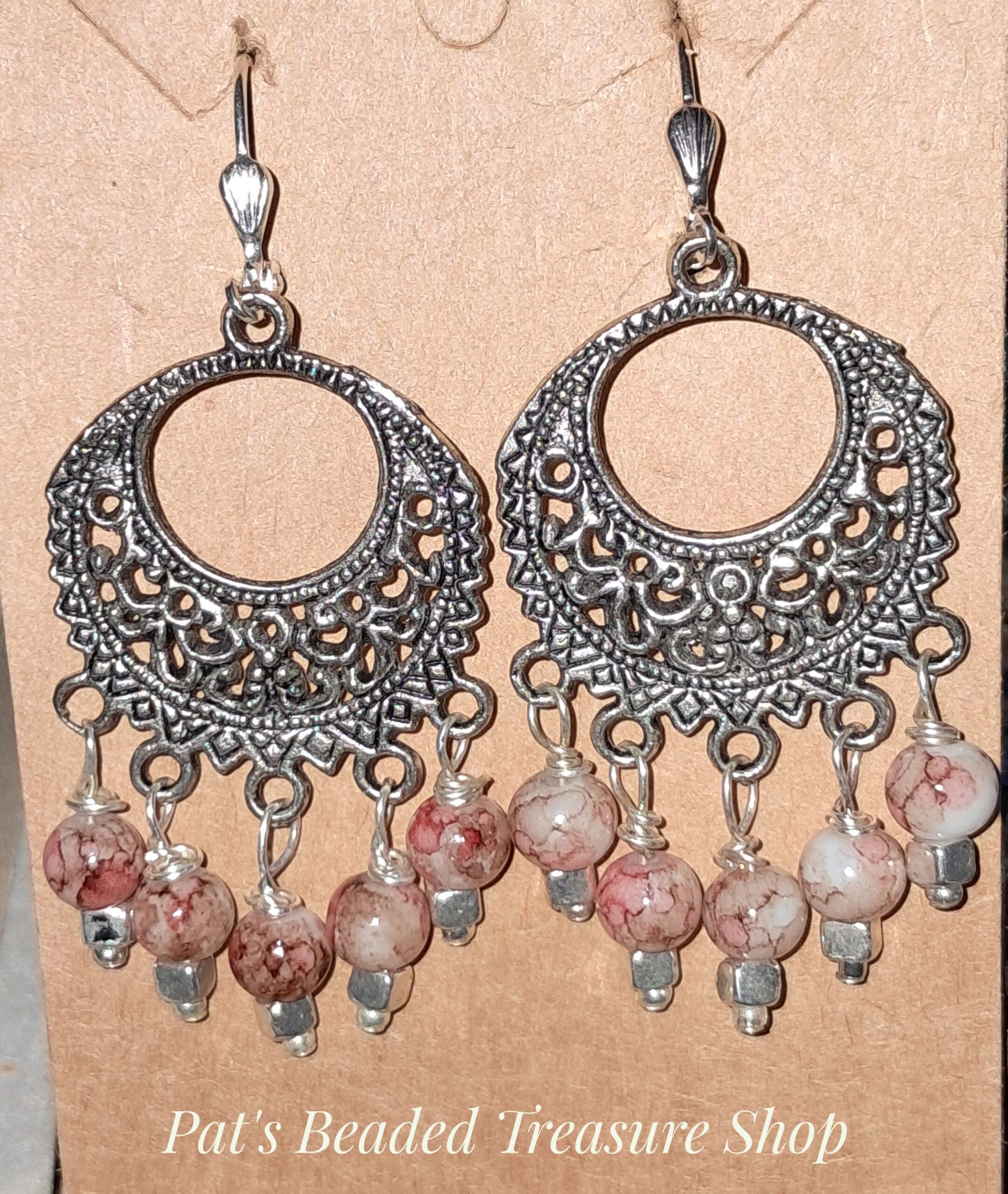 Handcrafted silver chandelier earrings with antique silver filigree charms and round marbled gemstone beads in soft cream and red tones. The detailed metalwork and dangling beads create beautiful movement and earthy elegance. Perfect for everyday wear or adding a touch of boho flair to your outfit.