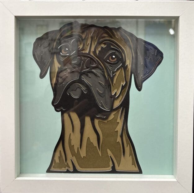 Showcase the loyal and expressive nature of the boxer with this handmade layered paper dog artwork. Thoughtfully crafted depth and detail make it a striking piece for dog lovers.