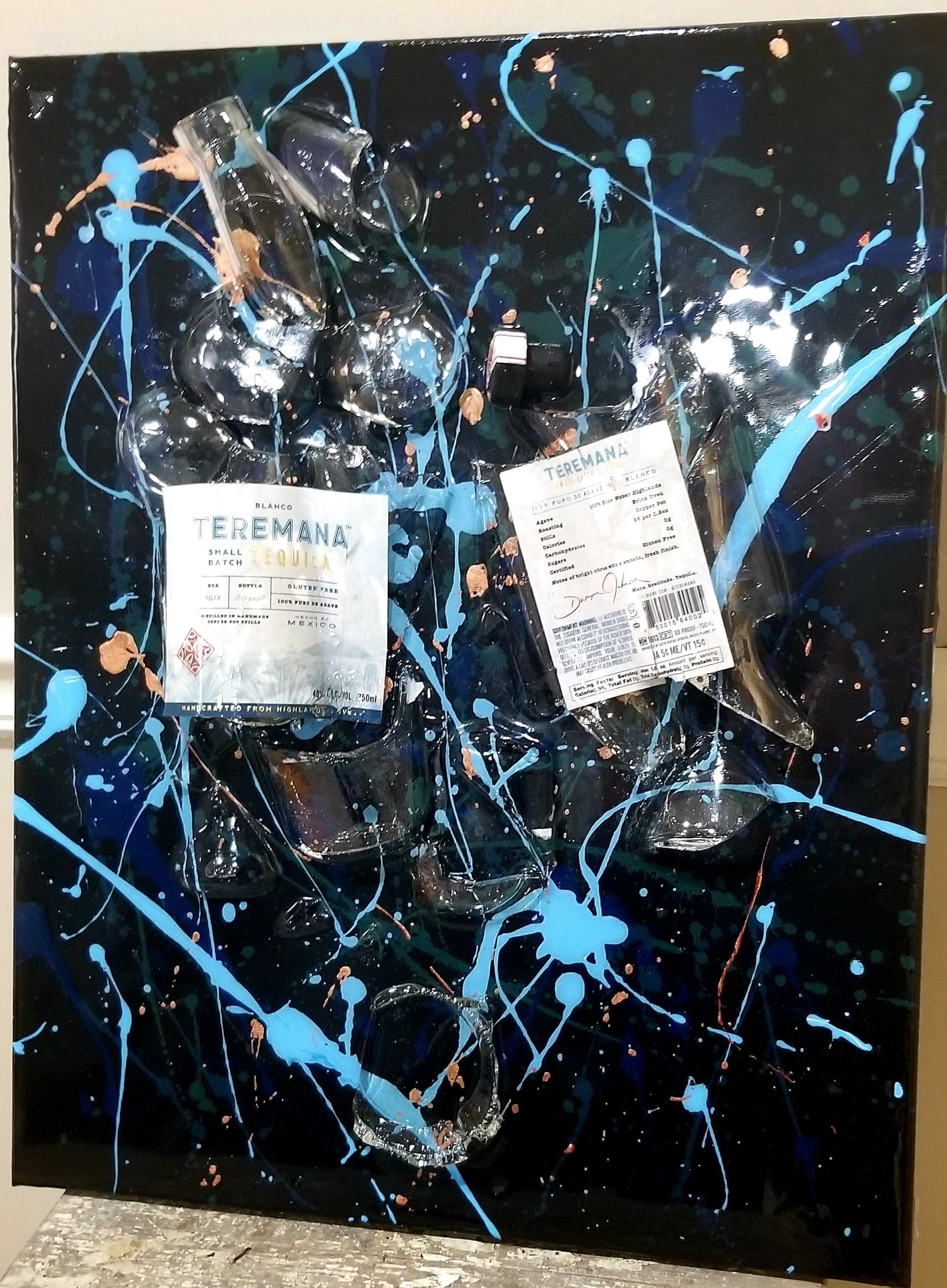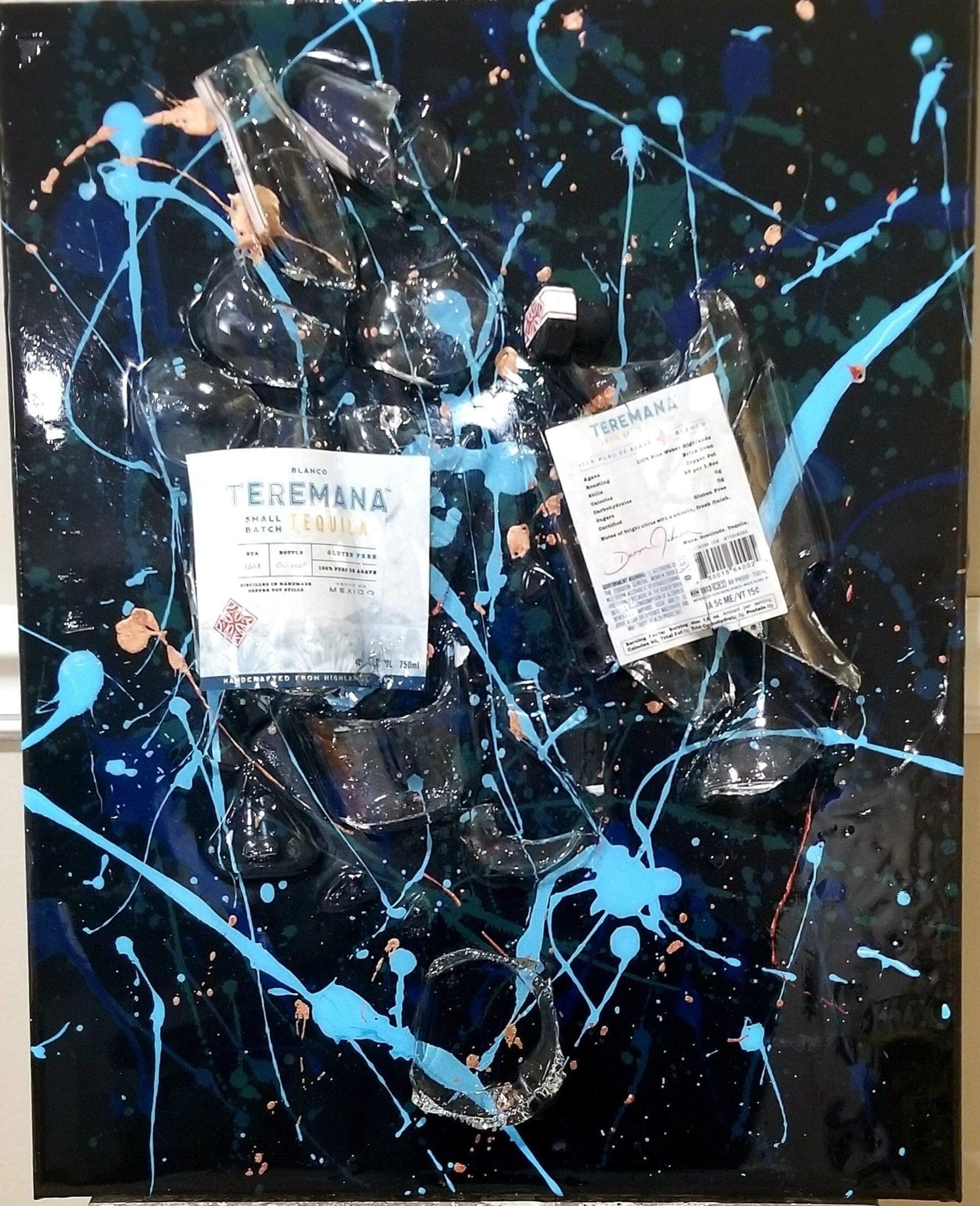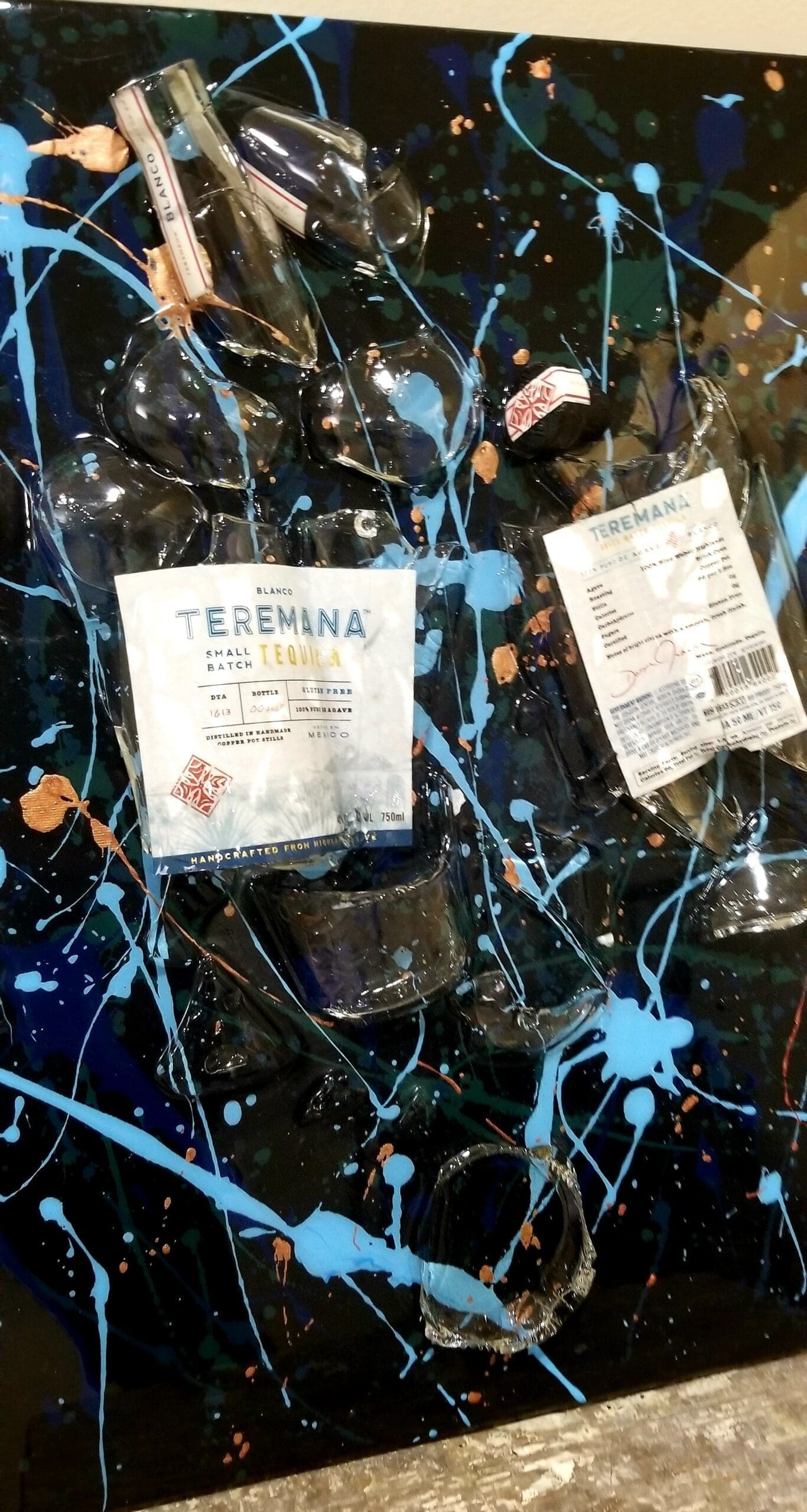This handmade unique mixed media piece features a carefully broken Teremana Blanco tequila bottle. The bottle and cork have been carefully laid out across the canvas.