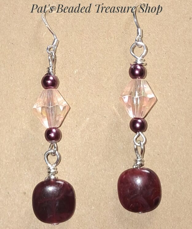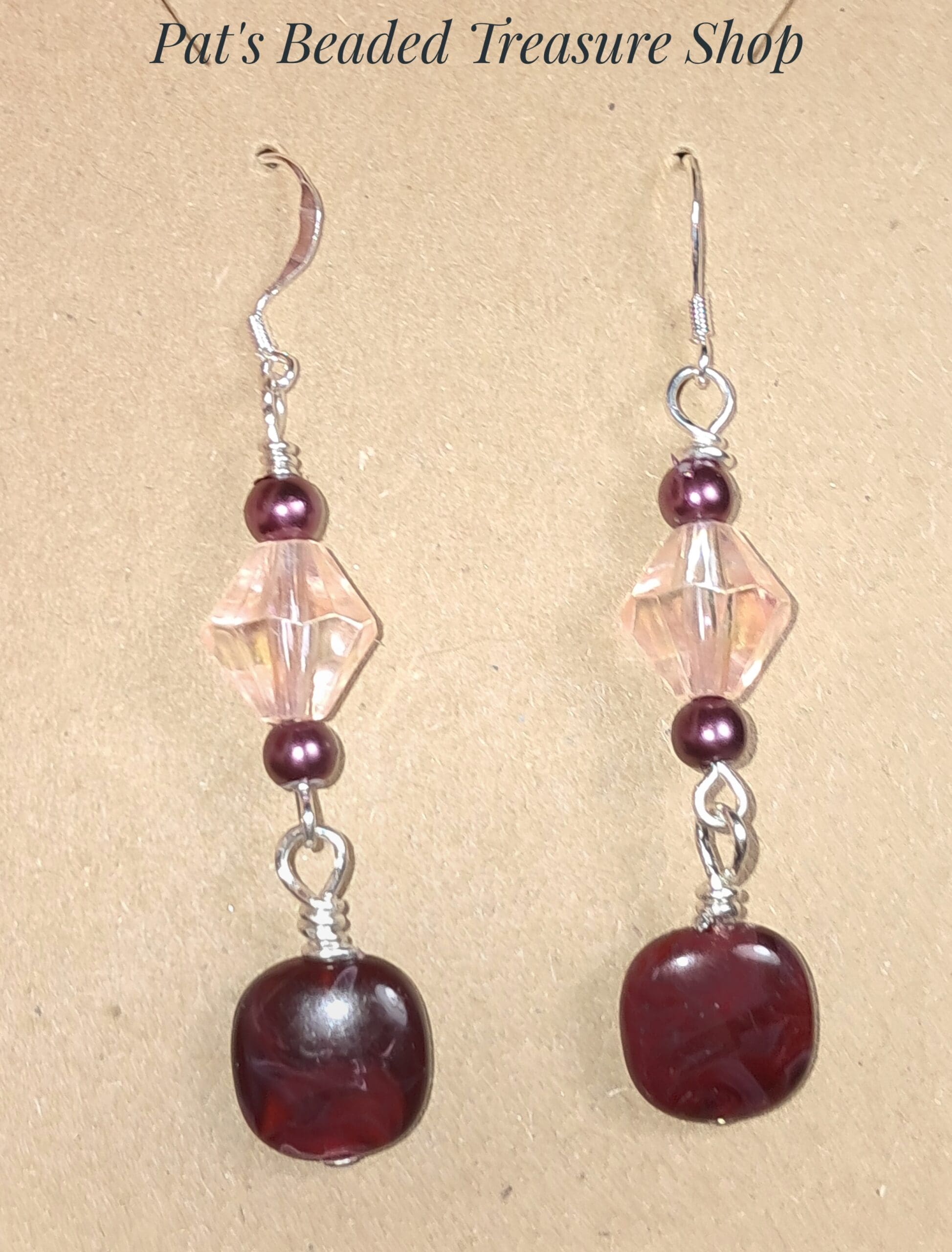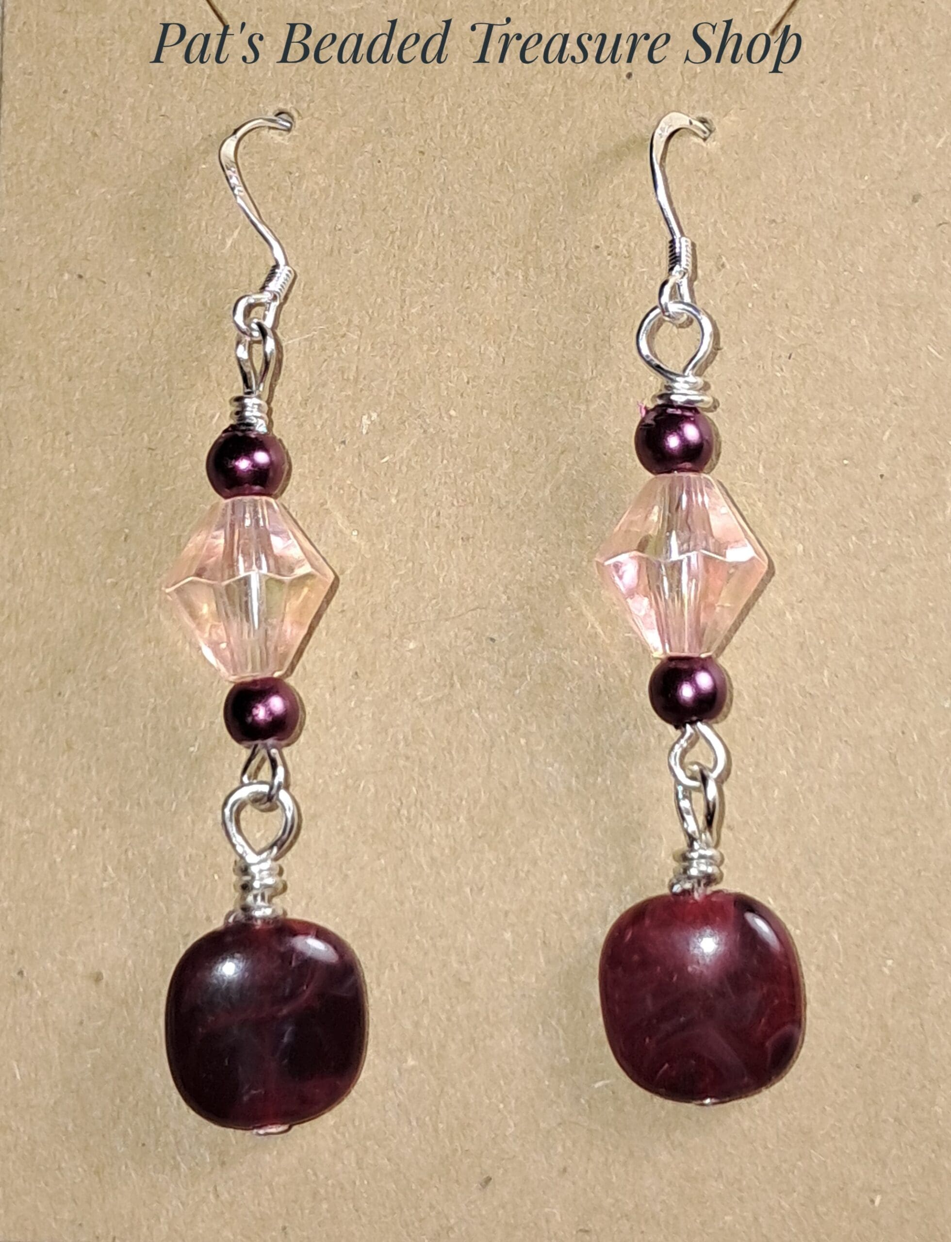 Rich, warm tones give these handcrafted earrings a beautifully elegant style. Deep burgundy acrylic beads create a bold focal point, paired with soft blush faceted beads that add gentle sparkle and contrast.