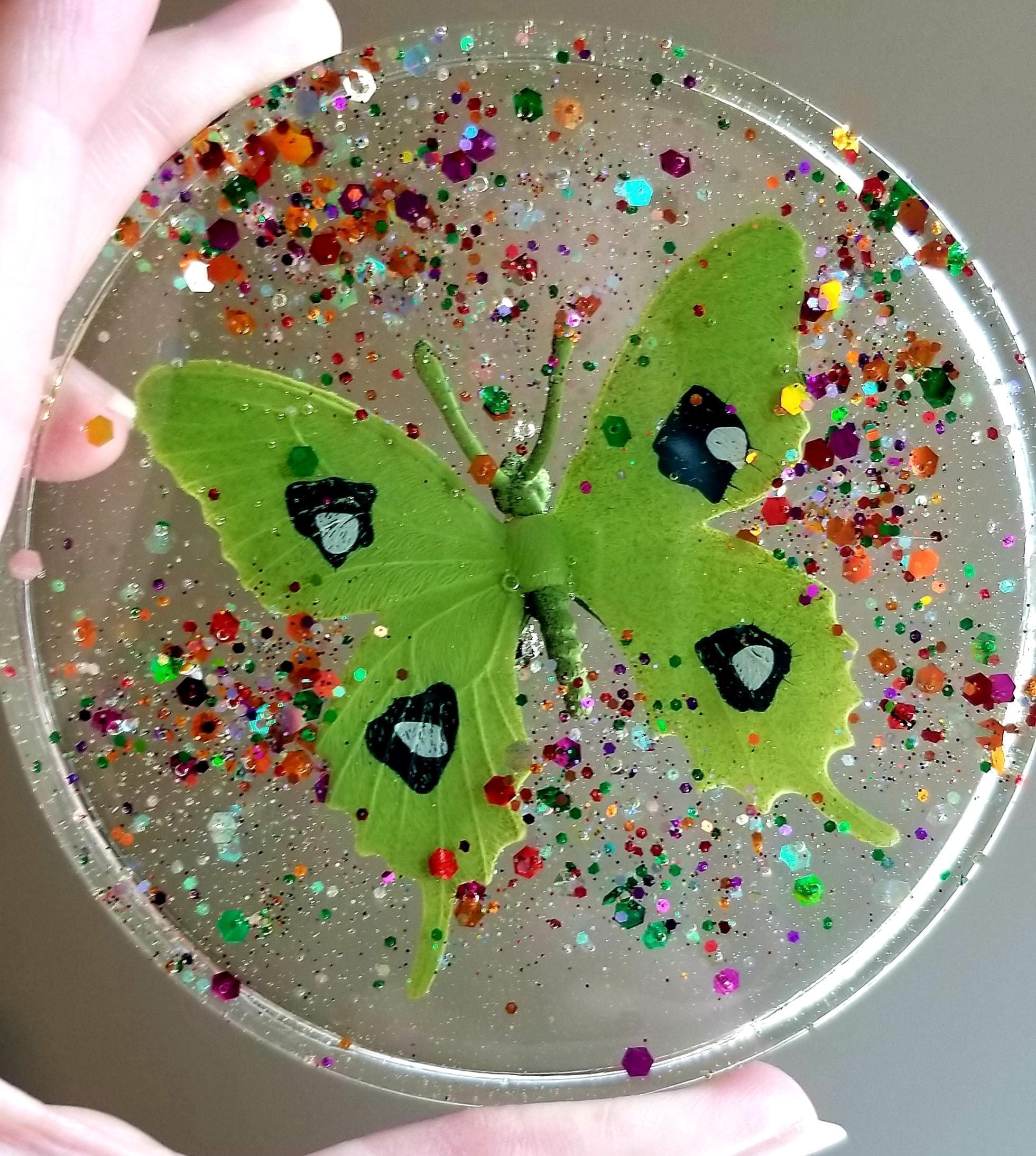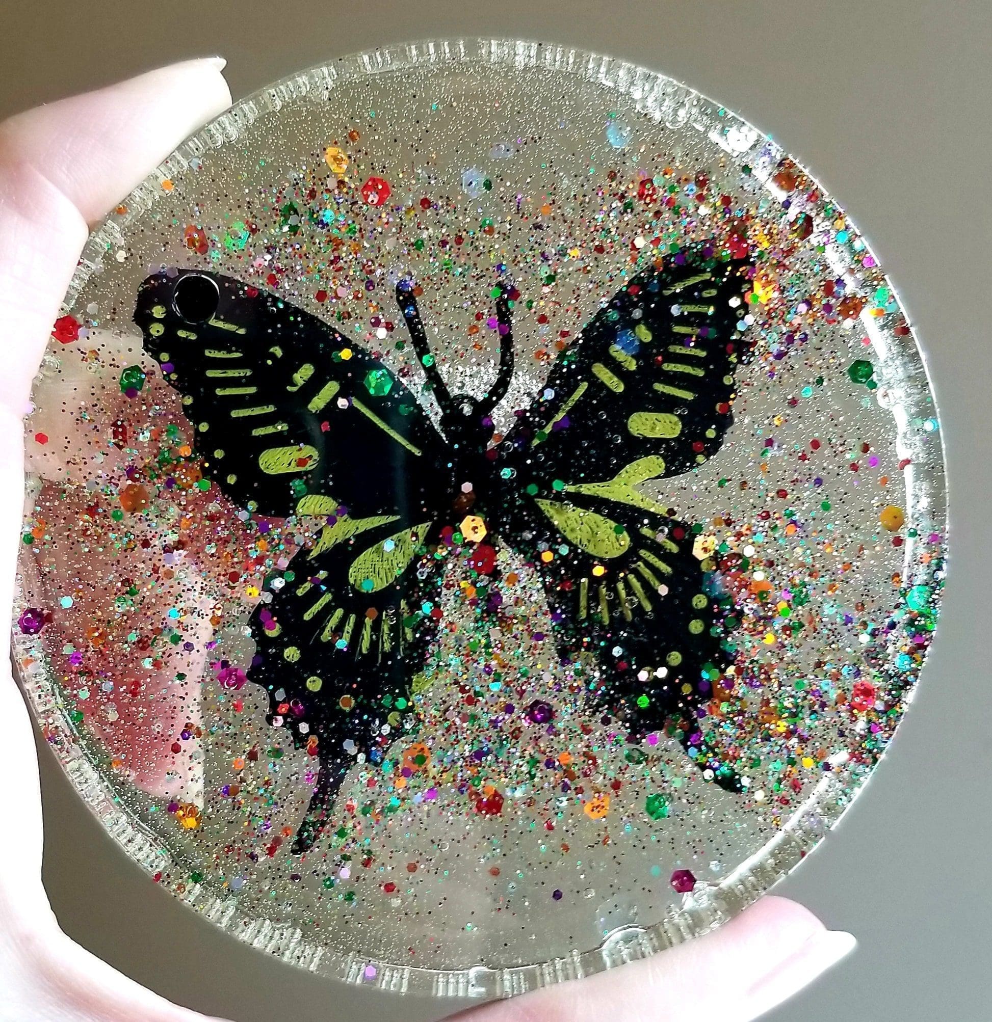 Each coaster is lovingly handcrafted to capture the grace and elegance of these beloved creatures, featuring intricate butterfly motifs adorned with vibrant rainbow hues of glitter.
