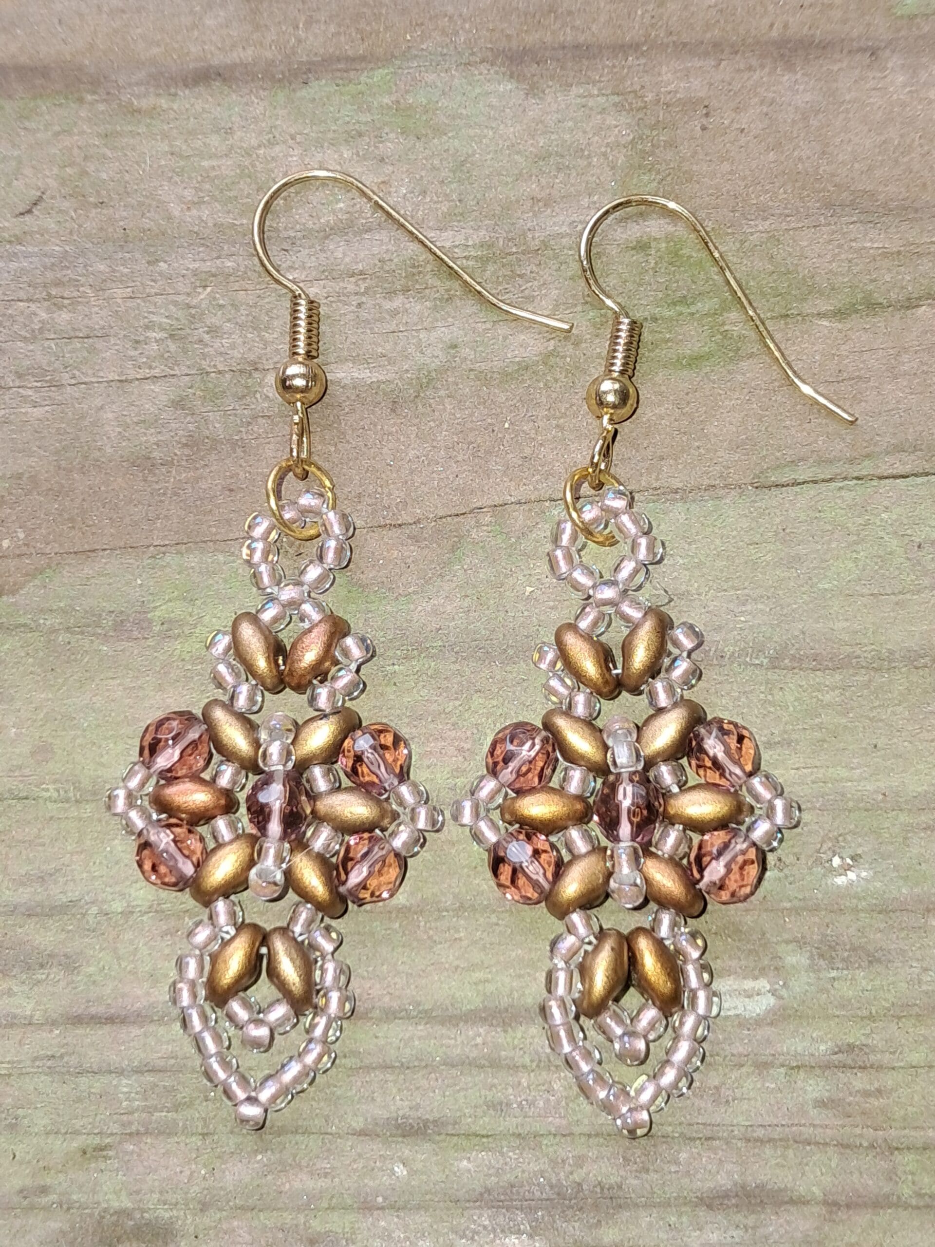 These handmade earrings feature a Celtic Inspired design accented with gold SuperDuo beads and light rose seed beads. Dark rose faceted round beads add a touch of sparkle and elegance.