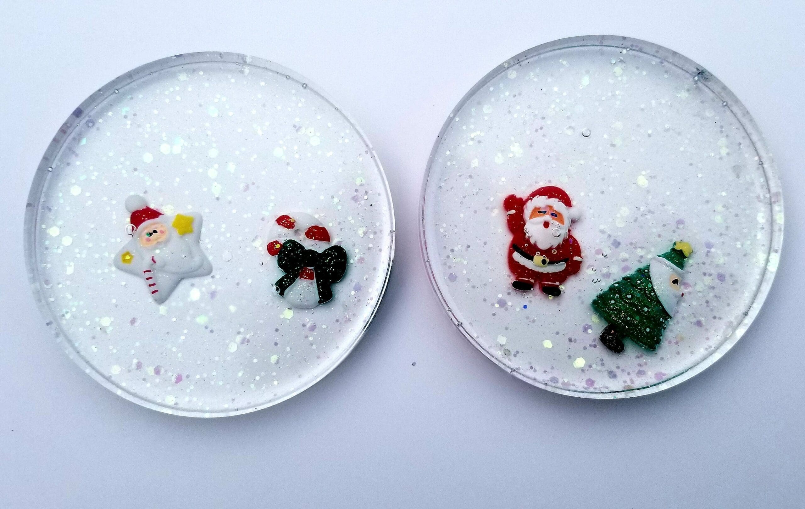 Christmas figures in the snow (white glitter) drink coasters. Each coaster is unique as each is hand crafted using Christmas figures, white glitter and clear resin.