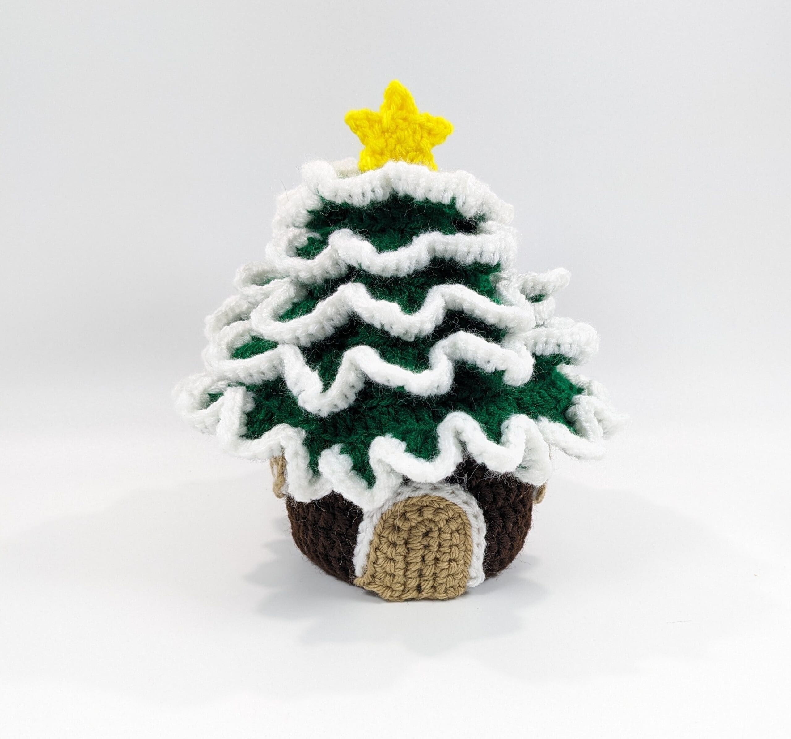 Also this cute Christmas Tree House Jar is crochet with acrylic yarn in several pieces. The house pieces are all hot glued in place.