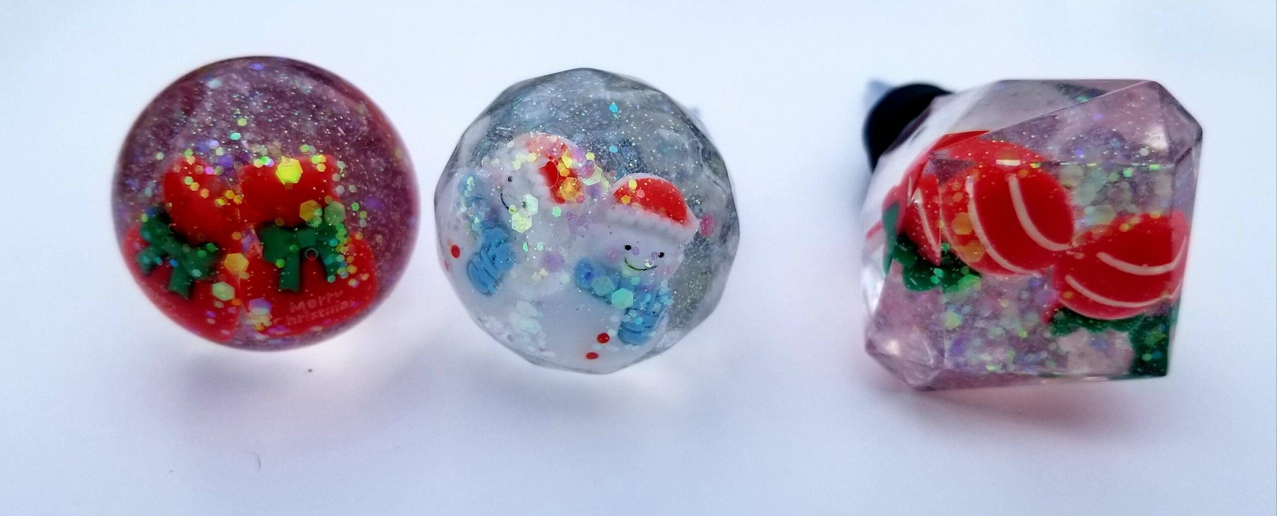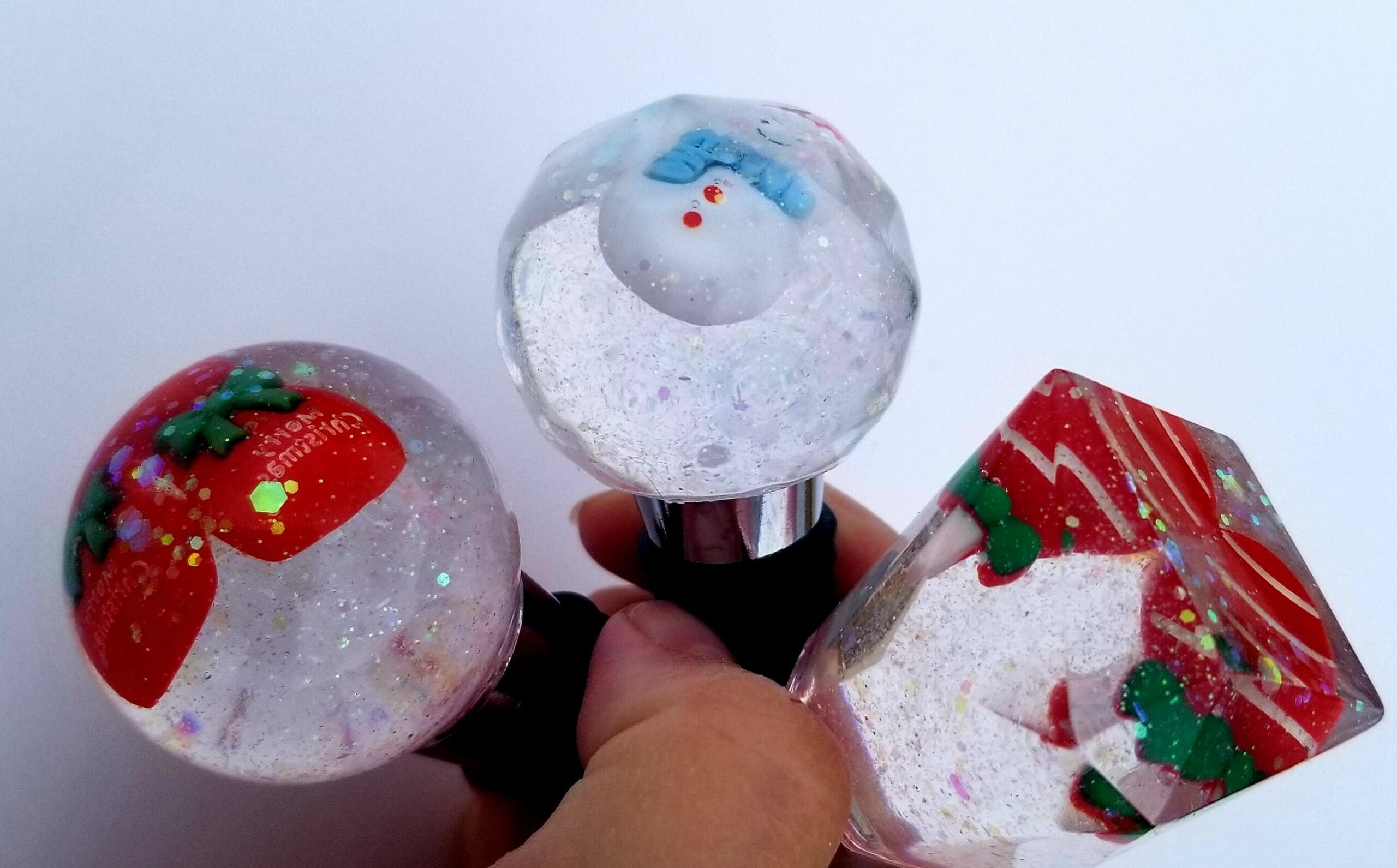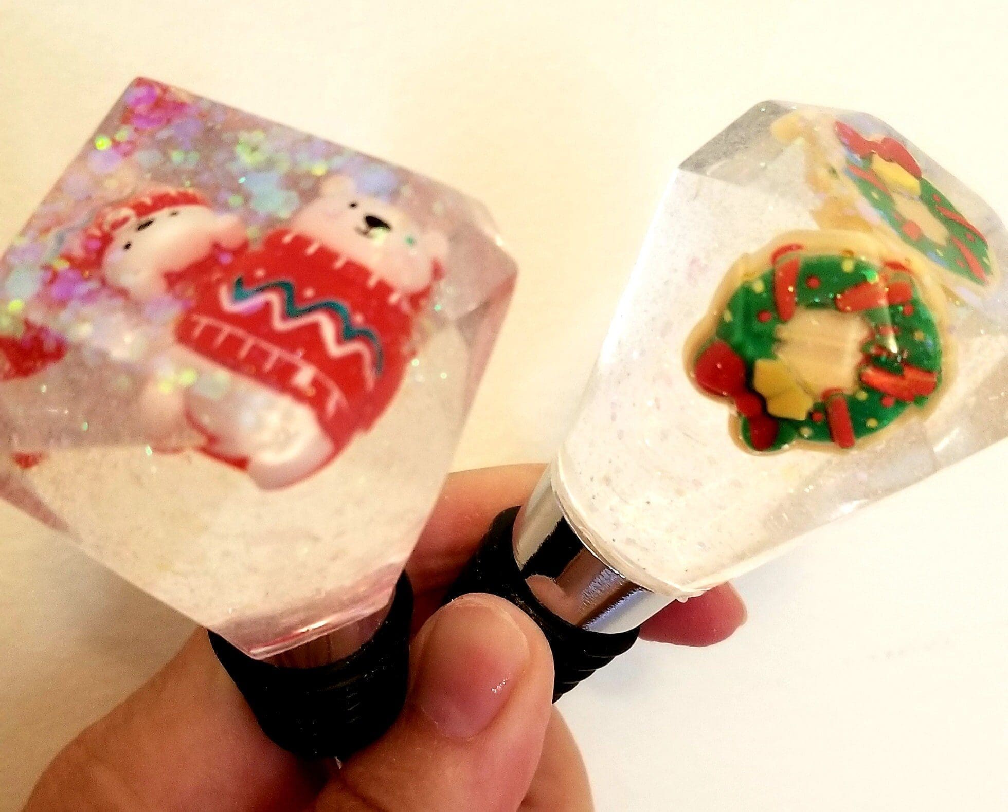 These Christmas themed glittery wine bottle stoppers are handcrafted and available with a variety of figurines. Wine stoppers are made from resin, white glitter and stainless steel. If you are looking for a custom color for your home bar or occasion, please let me know and I would be happy to make them!
