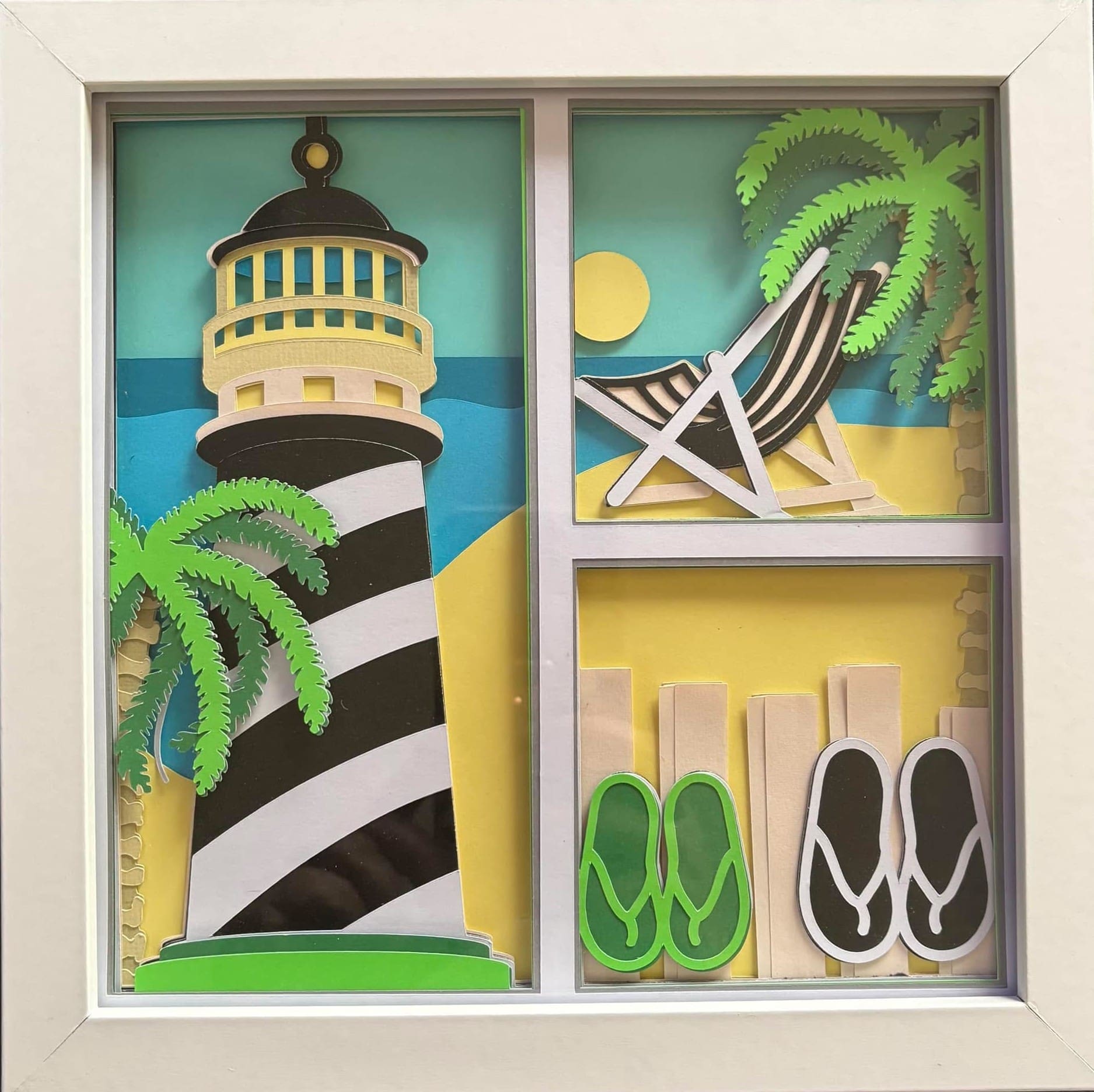 This handcrafted Coastal Lighthouse Shadow Box captures the peaceful charm of seaside living through layered paper artistry and thoughtful design. Featuring a classic striped lighthouse, palm trees, hammock, flip flops, and warm sunlit tones, this shadow box creates depth and movement that instantly transports you to a relaxing coastal escape.