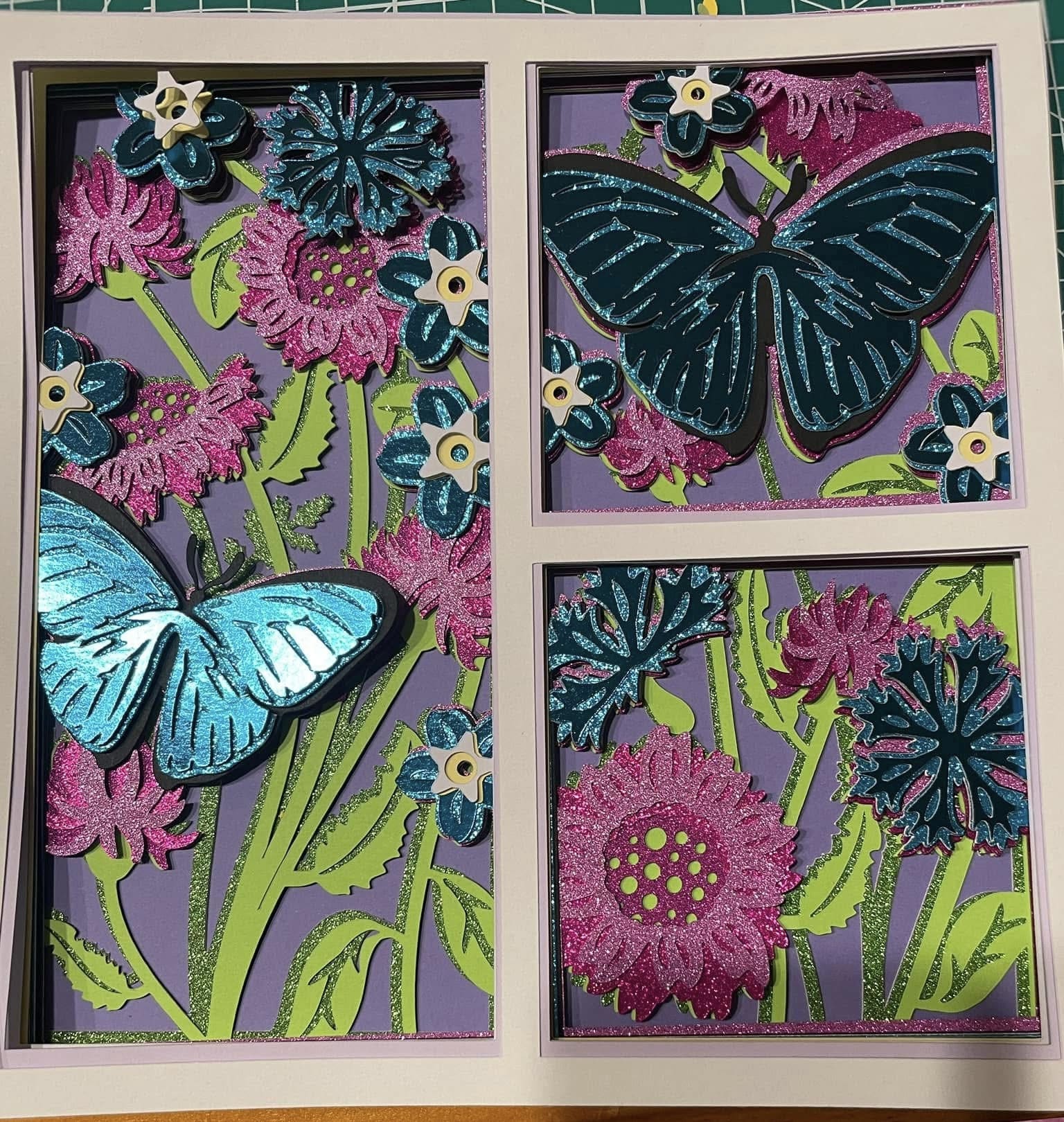 Each Colorful Butterfly Shadow Box is handmade with attention to detail and color balance. Rich jewel tones blend with soft floral shapes, while glitter accents catch the light and add subtle sparkle without overpowering the design. The butterflies appear to float above the flowers, creating a layered garden scene that feels fresh and uplifting. Every element is thoughtfully placed to ensure the composition feels full yet balanced.