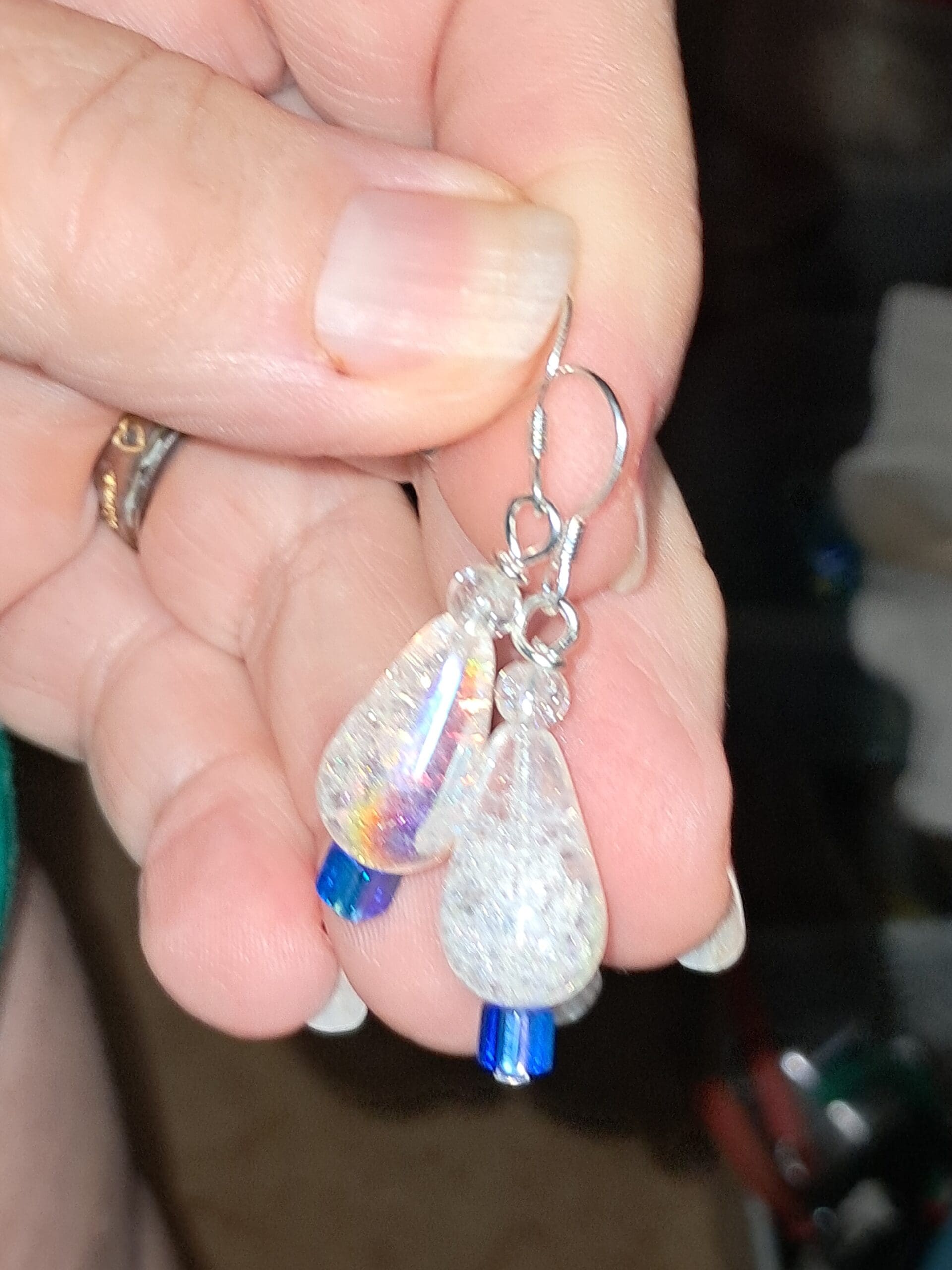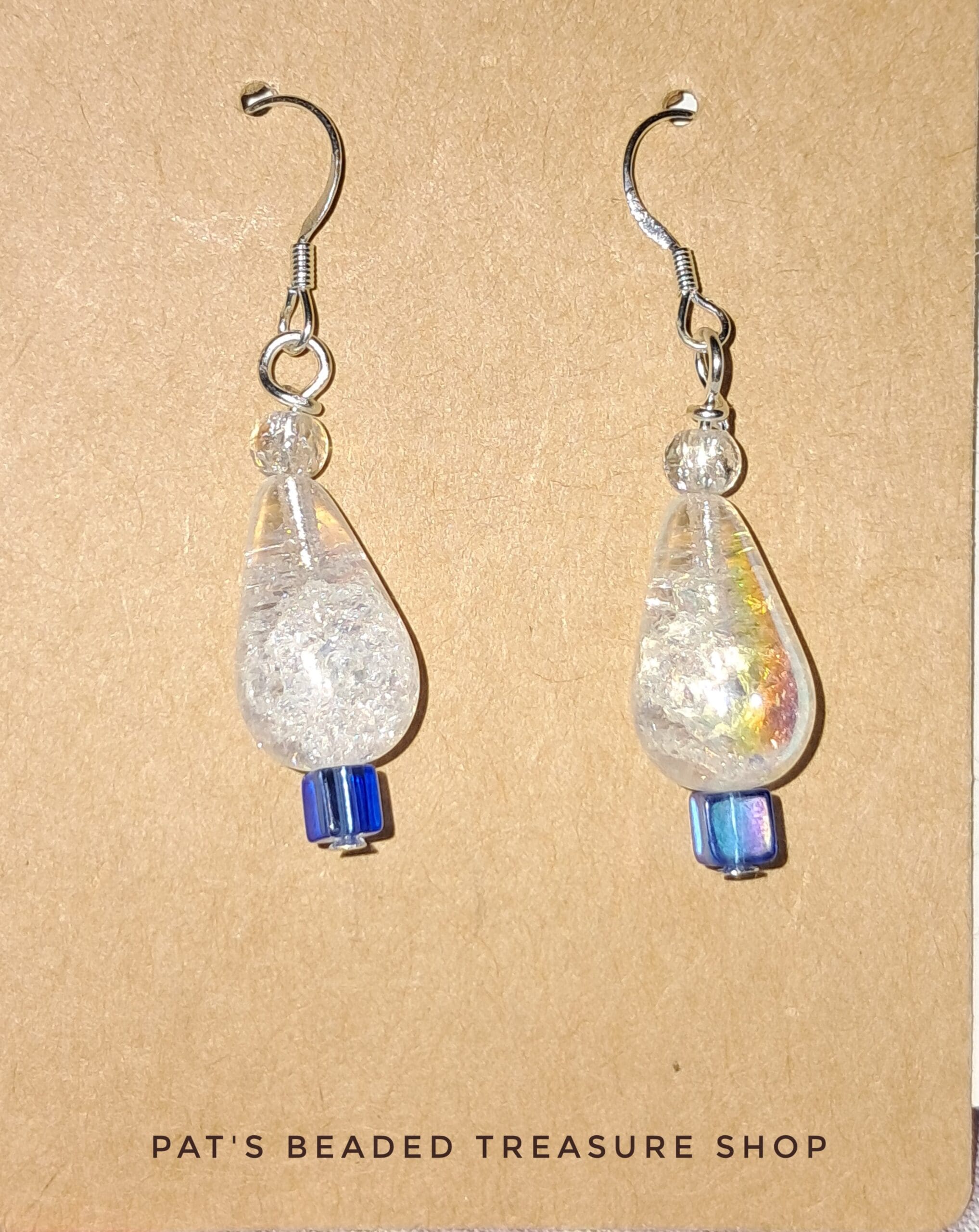 Beautiful handcrafted earrings featuring shimmering cracked glass teardrops accented with cobalt AB cube beads. Lightweight and elegant—perfect for day or night wear.