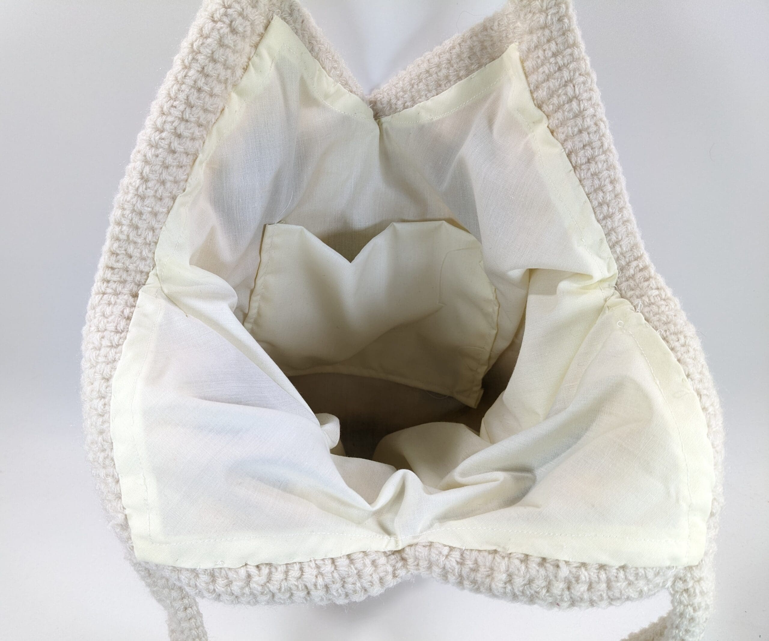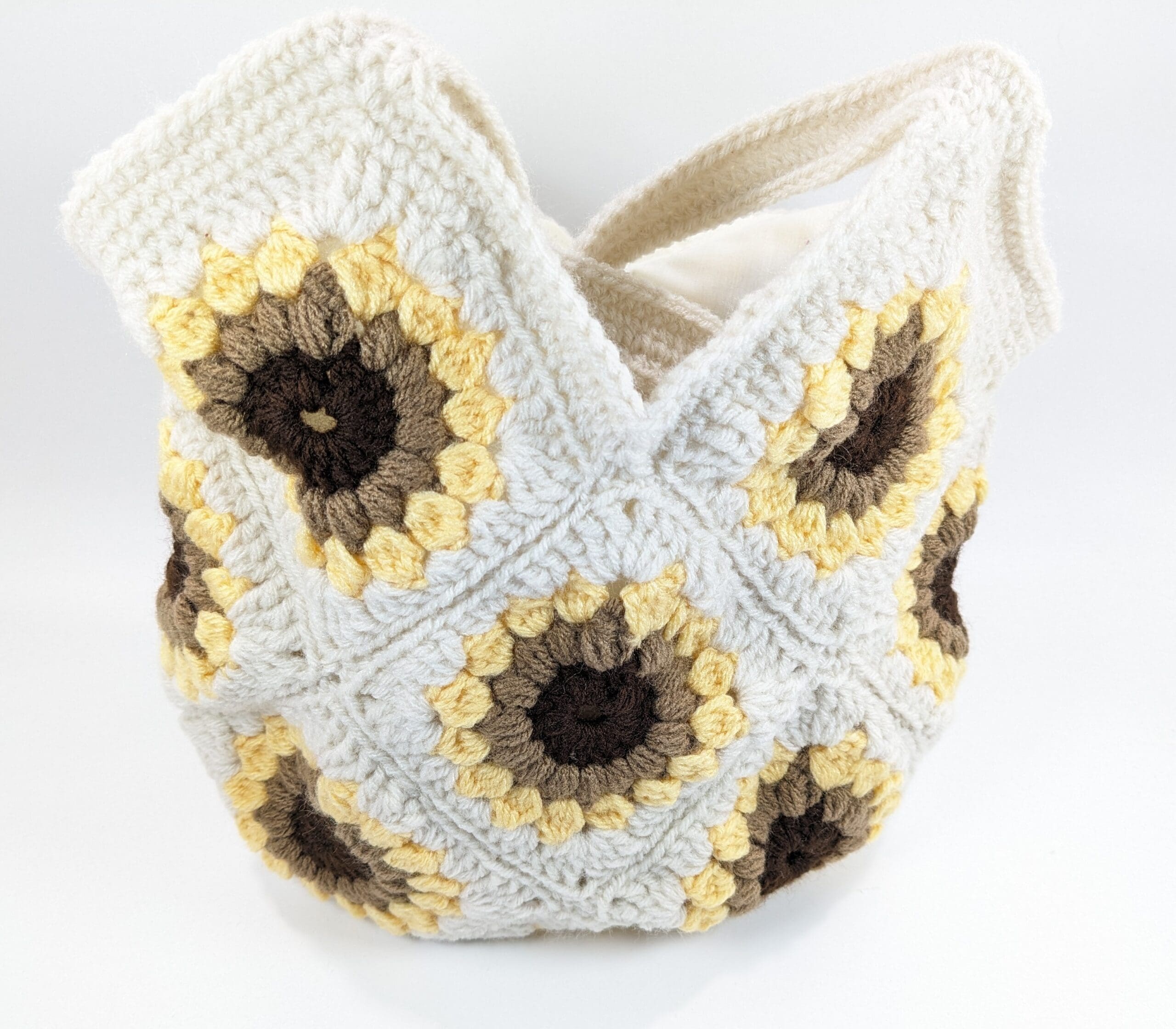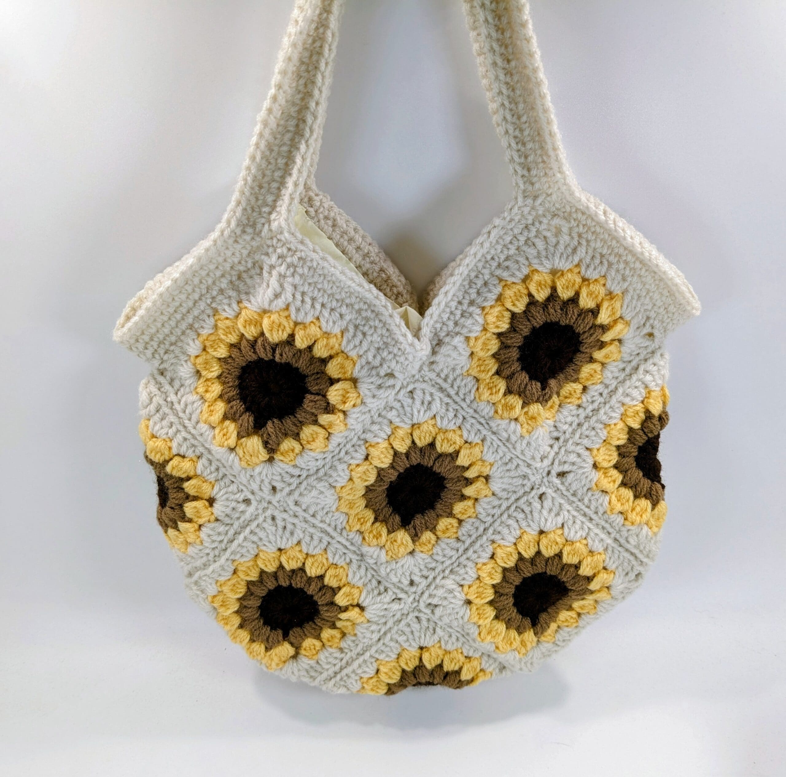 Also Cream Crochet Daisey Shoulder Bag is crochet with an acrylic yarn. The bag has a material lining that has been hand sewn to the bag,