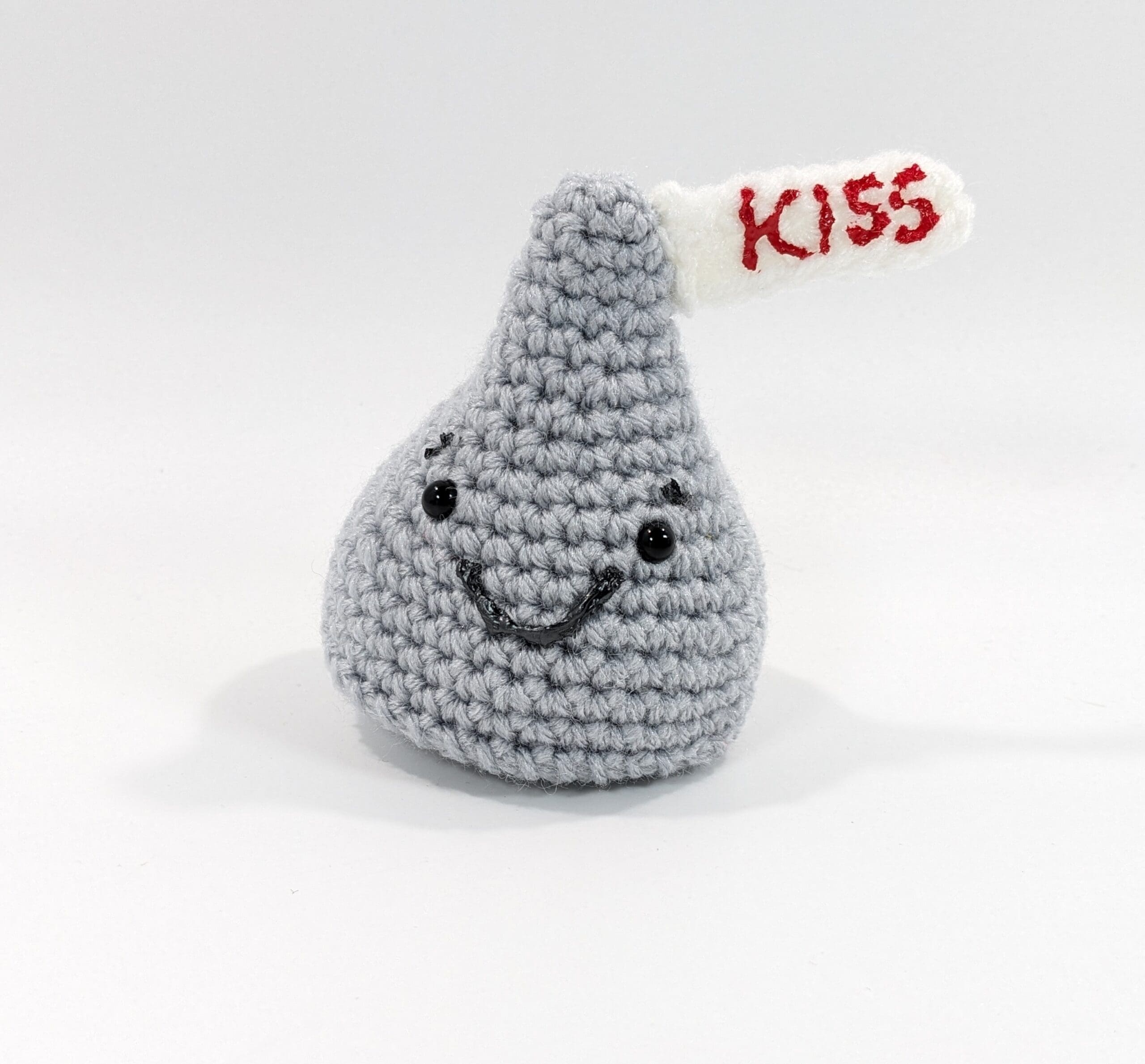 Crochet Valentine Kiss Plush Gift. You can give this kiss to someone you love and it will last forever. Also, this cute Kiss measures around 5 inches tall. You can have one made in another color like pink, red, purple or white. Also you can have the word love. Be Mine, or Friends on the tag. You can find a selection of more fun Valentine items in my shop, link below.