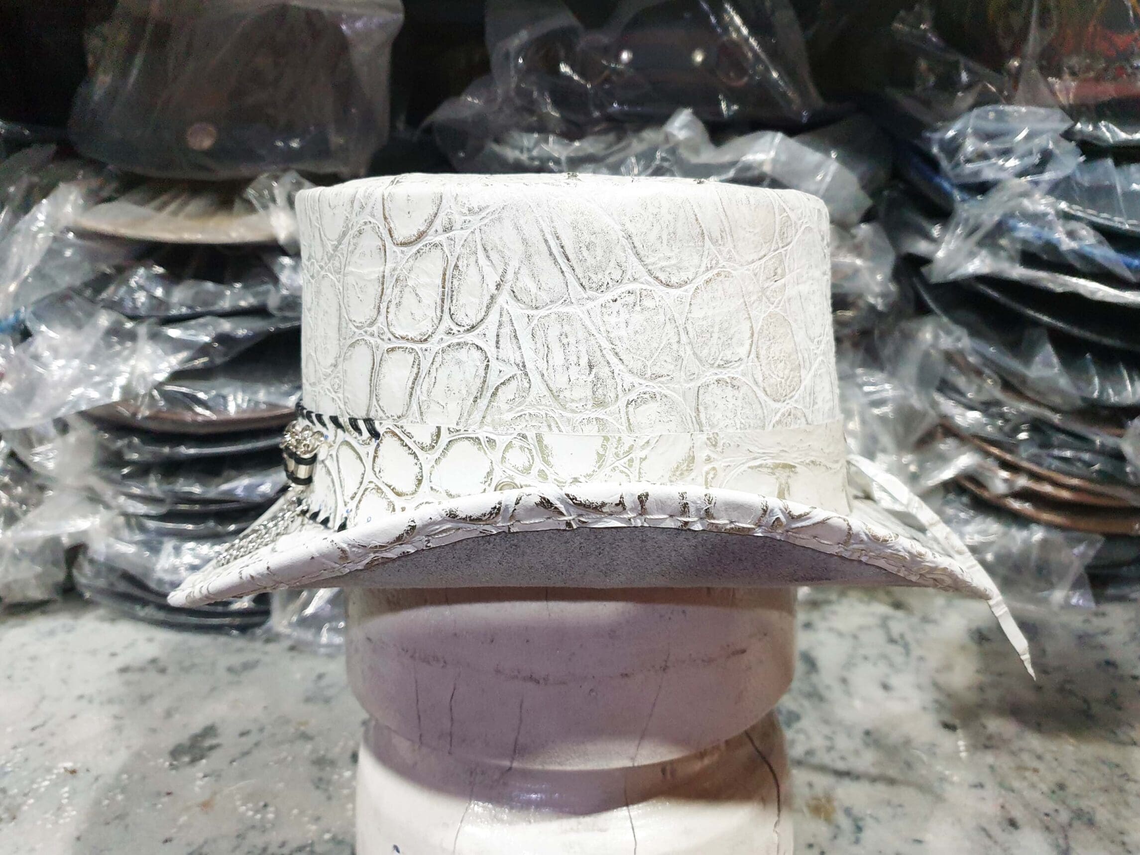 Whether you’re looking to make a statement at a formal event or simply want to add an edge to your everyday style, the Crocodile Texture embossed white leather El Dorado top hat is sure to turn heads and elevate your look.