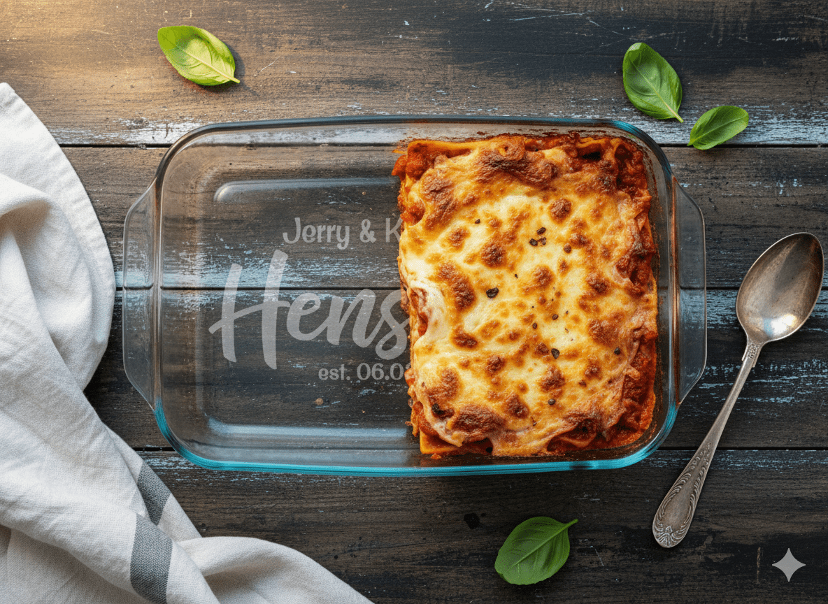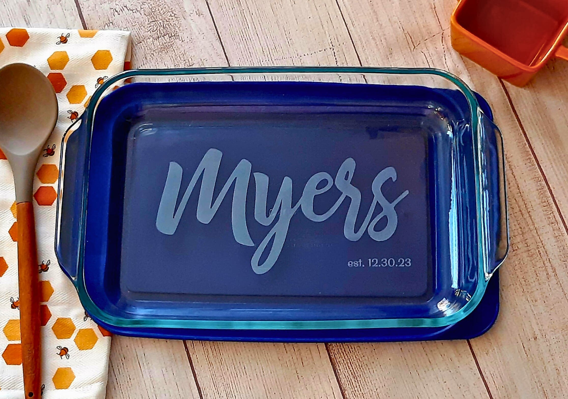 Custom engraved 9×13 glass casserole pan with your choice of names, family name, or wedding date. A unique and practical gift for weddings, anniversaries, or housewarmings. Dishwasher and oven safe, professionally etched for a lasting design.