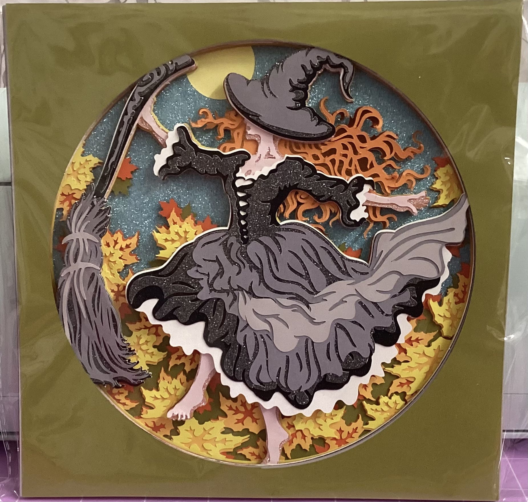 This handmade Dancing Witch Shadow Box is a striking piece of layered paper art designed to celebrate the mystery and movement of the Halloween season. Featuring a dynamic witch silhouette dancing, this handcrafted shadow box combines intricate paper layering with rich autumn tones, creating depth that draws the eye from every angle. The flowing dress, sweeping broom, and textured background of falling leaves come together to form a scene that feels alive and expressive.