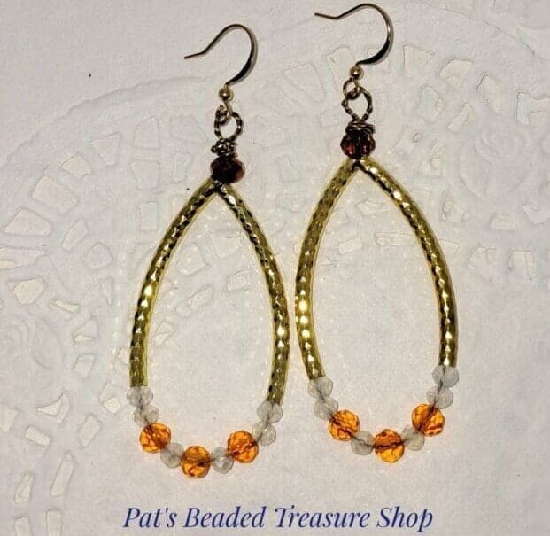 These handcrafted Dangle Earrings feature a gold-toned teardrop frame accented with amber-orange, crystal-clear, and deep brown beads. Measuring 3 inches long and 1 inch wide, they’re lightweight and comfortable with gold-plated fish hook ear wires. Custom color options are available to match your personal style or special occasion.