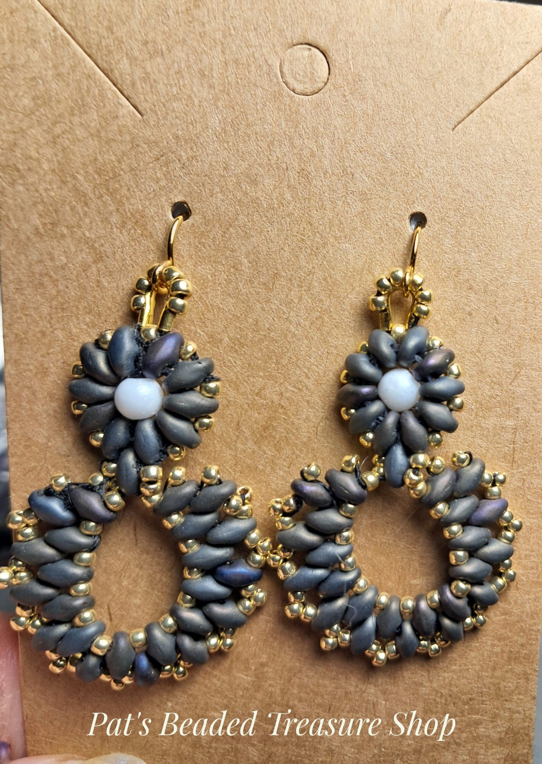 Elevate your style with these handcrafted double-circle beaded earrings from Pat’s Beaded Treasure Shop. Made with matte dark gray superduo beads, shimmering gold seed beads, and a soft white accent bead at the center, these earrings feature a striking floral top and looped circle design. Lightweight yet eye-catching, they’re perfect for special occasions or everyday elegance.