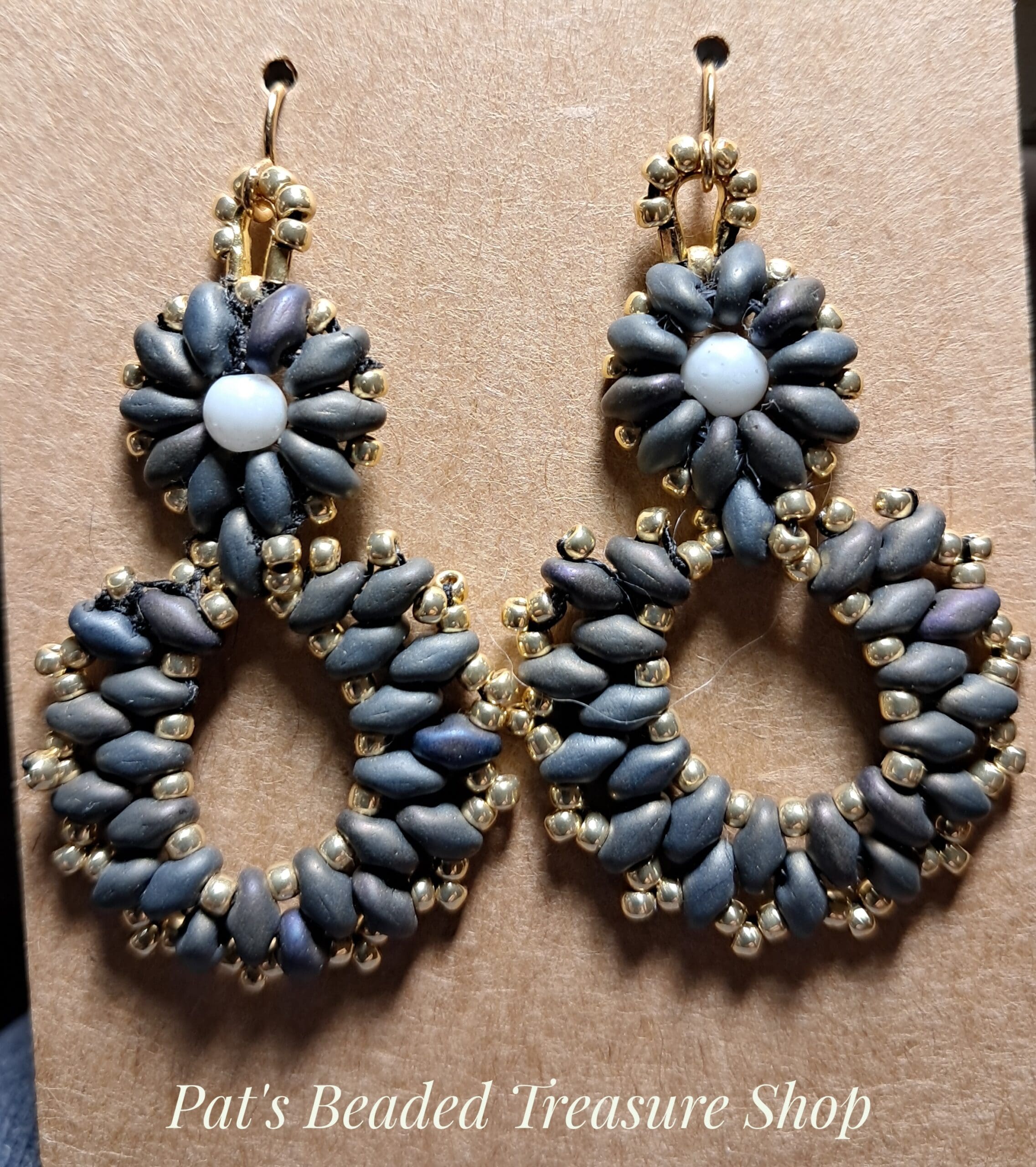 Materials: Matte dark gray superduo beads, gold glass seed beads, white round center bead, gold-tone ear wires
