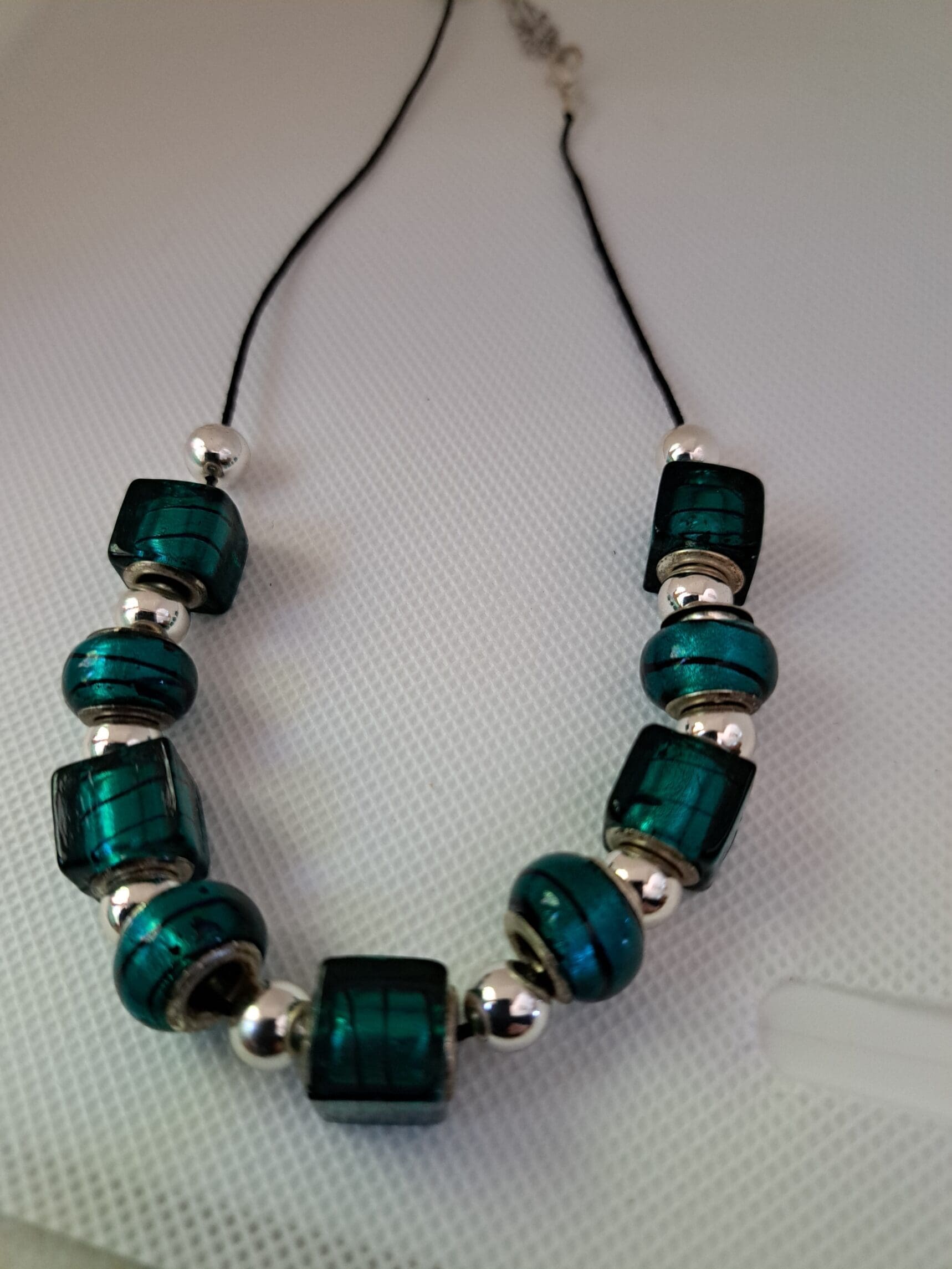 You’ll attract lookers when you wear this shimmery teal/green and silver necklace