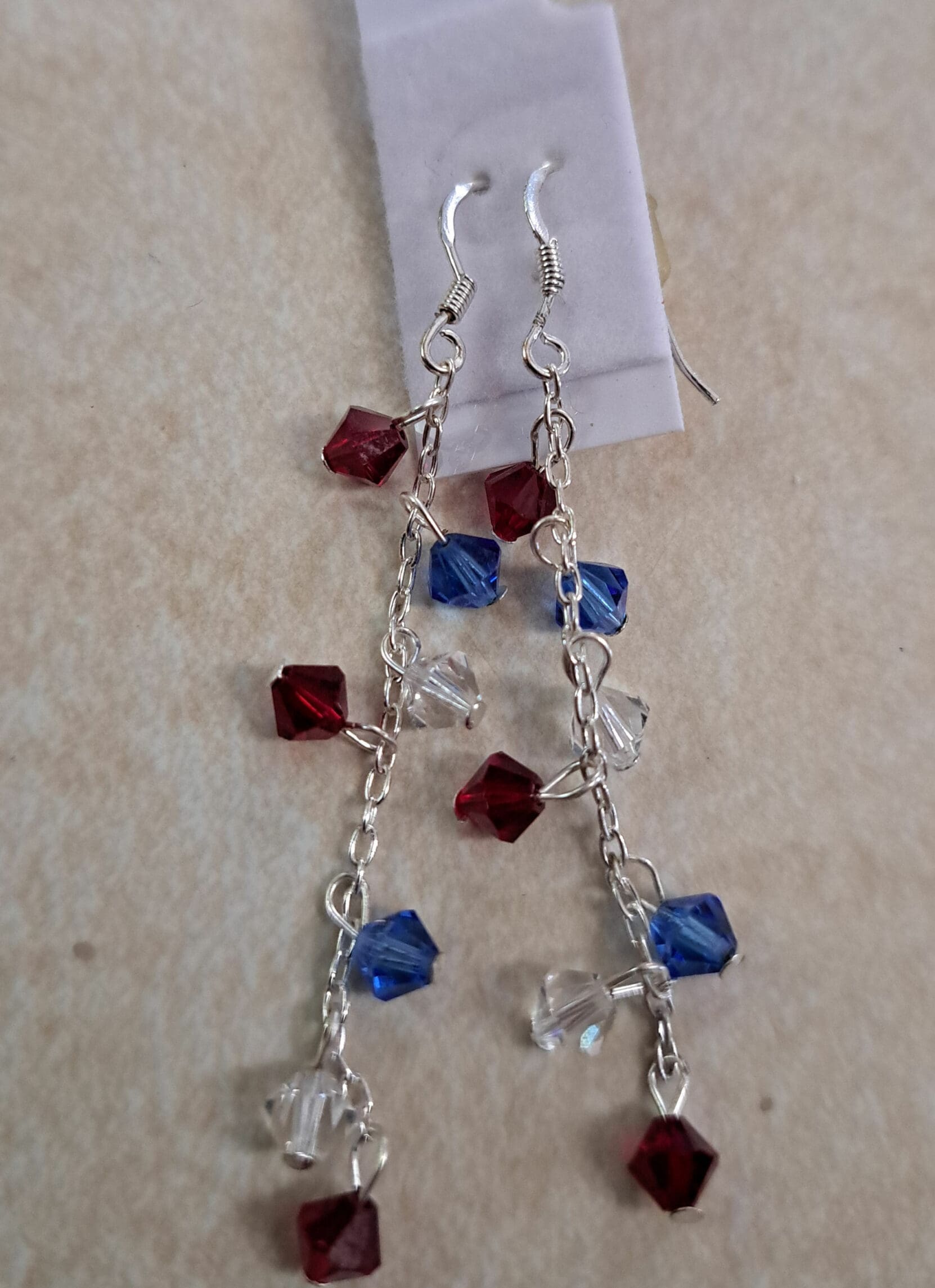 Add a burst of sparkle to your outfit with these lightweight red, white, blue crystal dangle earrings on silver plated ear wires.