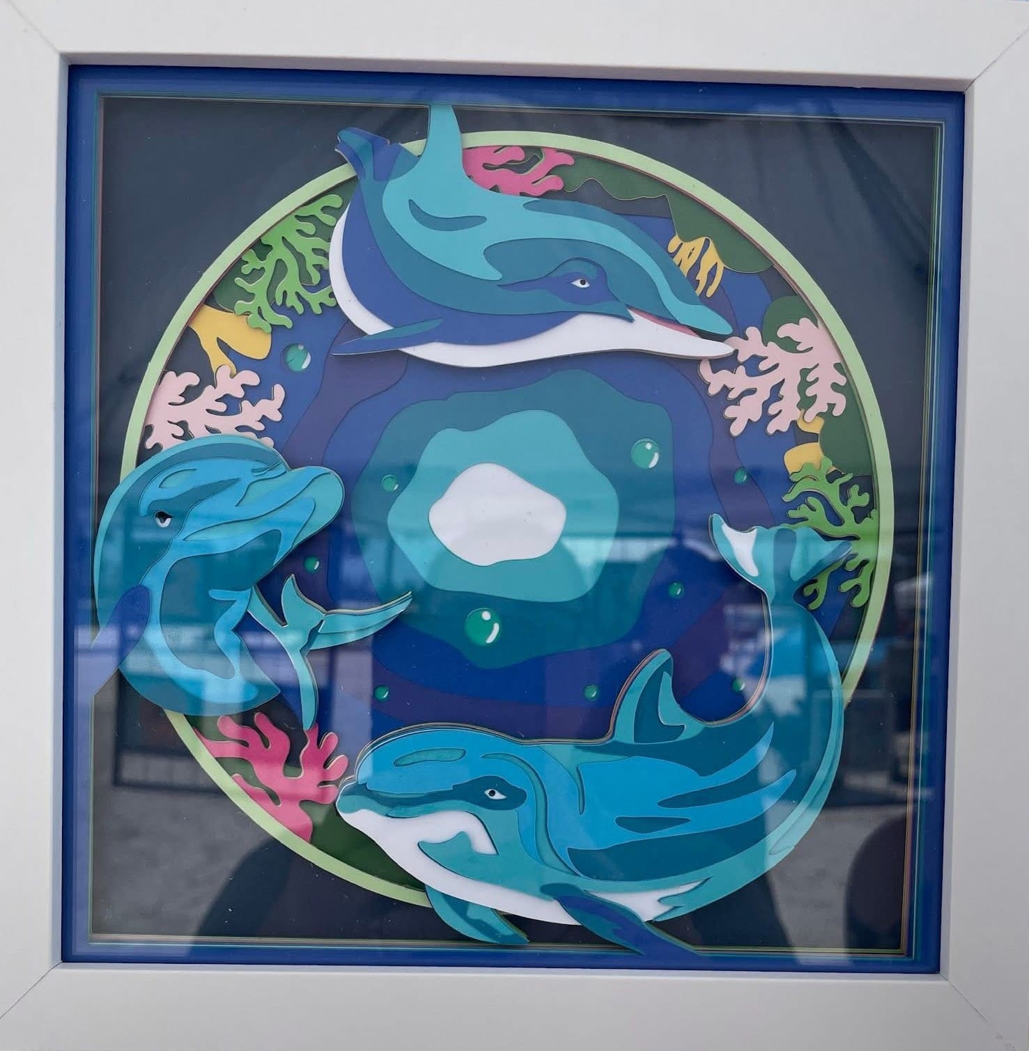 Bring the beauty of the ocean into your home with this handcrafted dolphin shadow box. This layered paper artwork features graceful dolphins swimming in a vibrant underwater scene, perfect for coastal decor lovers and ocean enthusiasts.