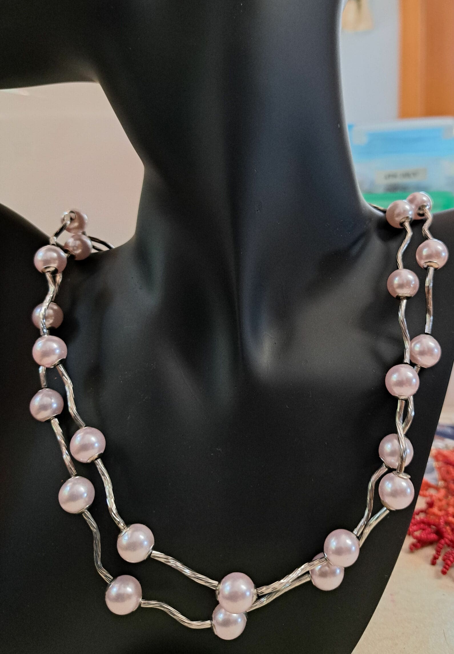 Elevate your look with the delicate allure of this handmade faux, double stranded, 18″ pink pearl necklace, adorned with gleaming silver-plated tube beads. Each bead and pearl is carefully selected, creating a piece that exudes timeless elegance and sophistication.