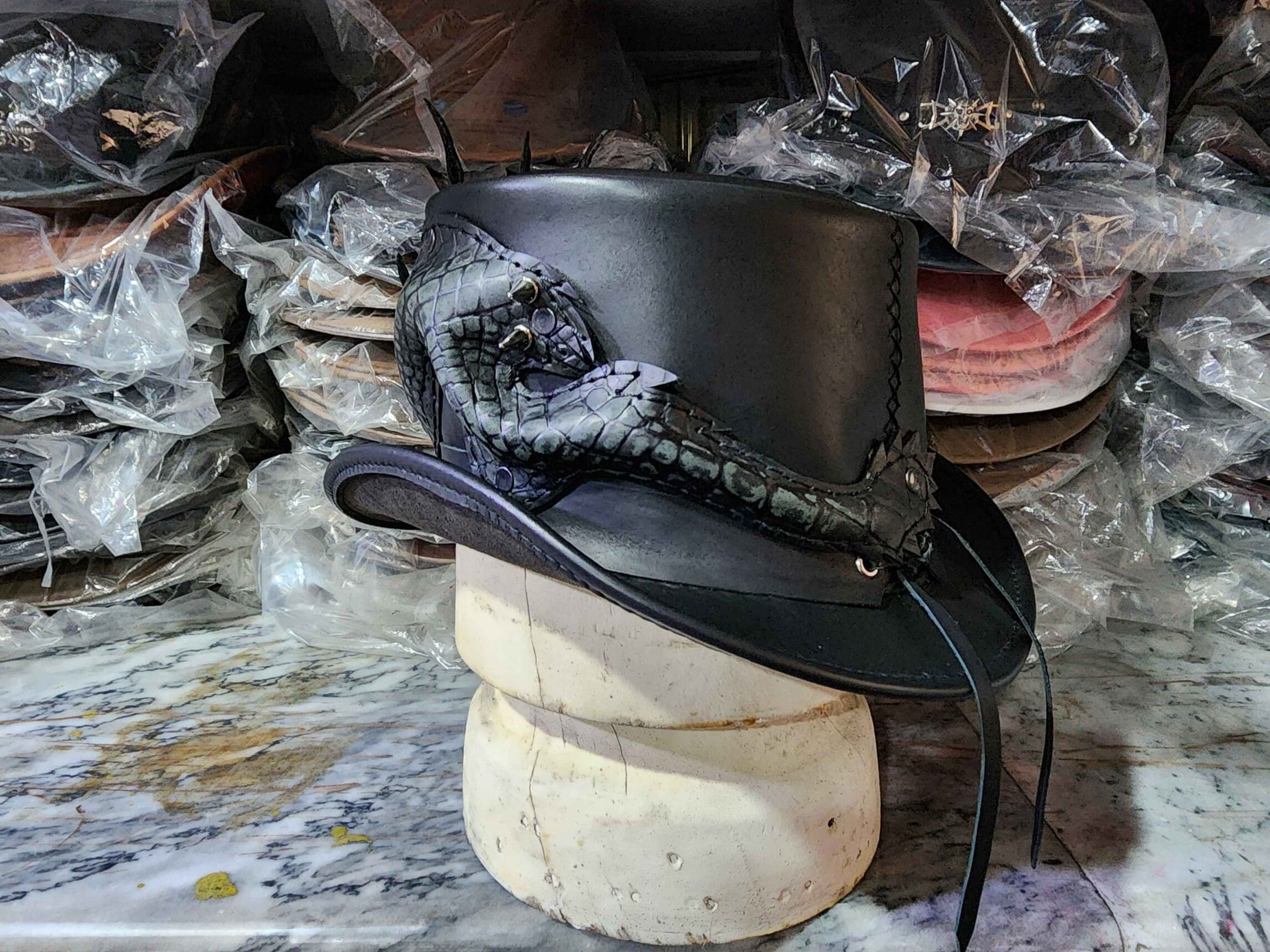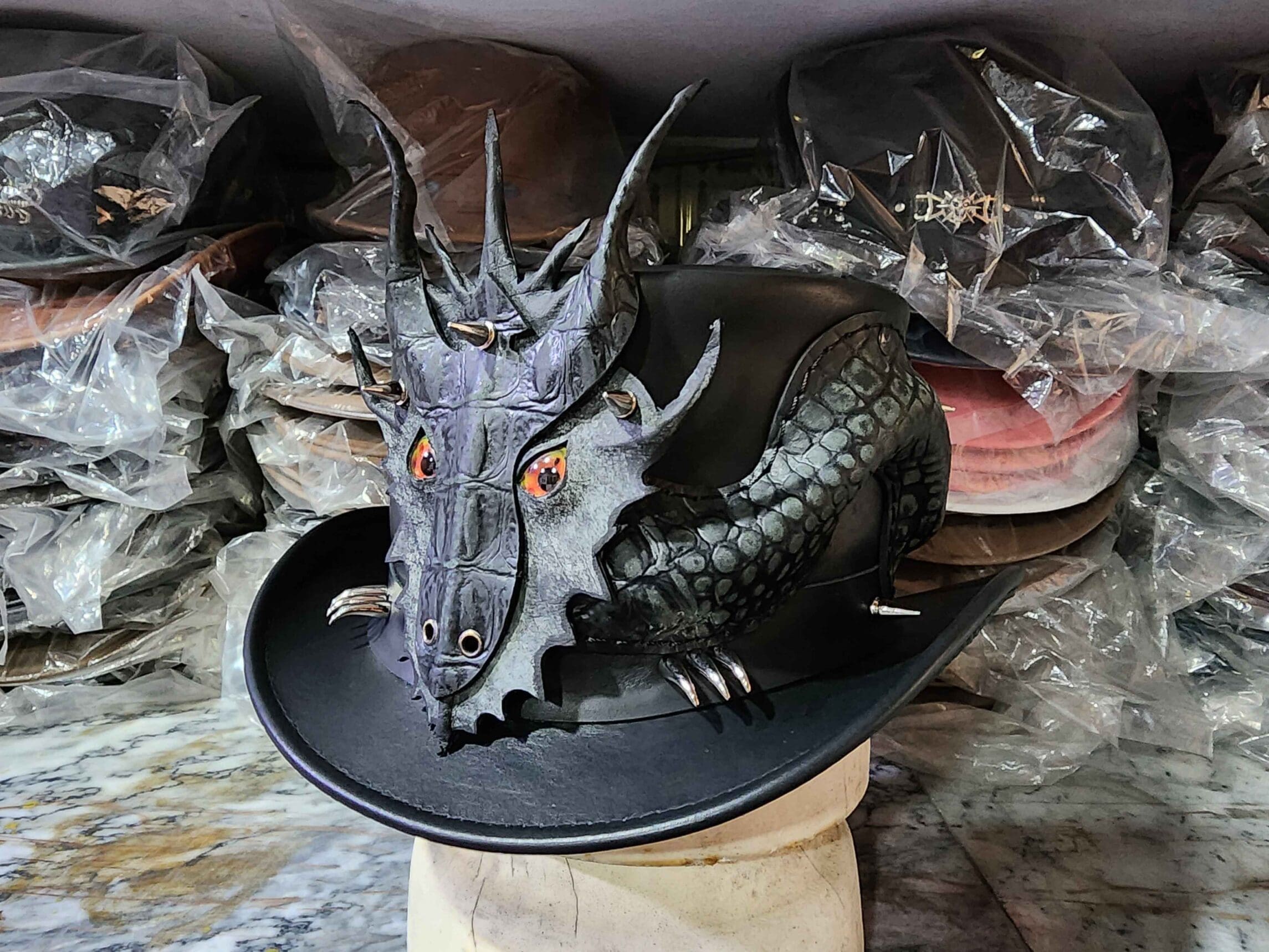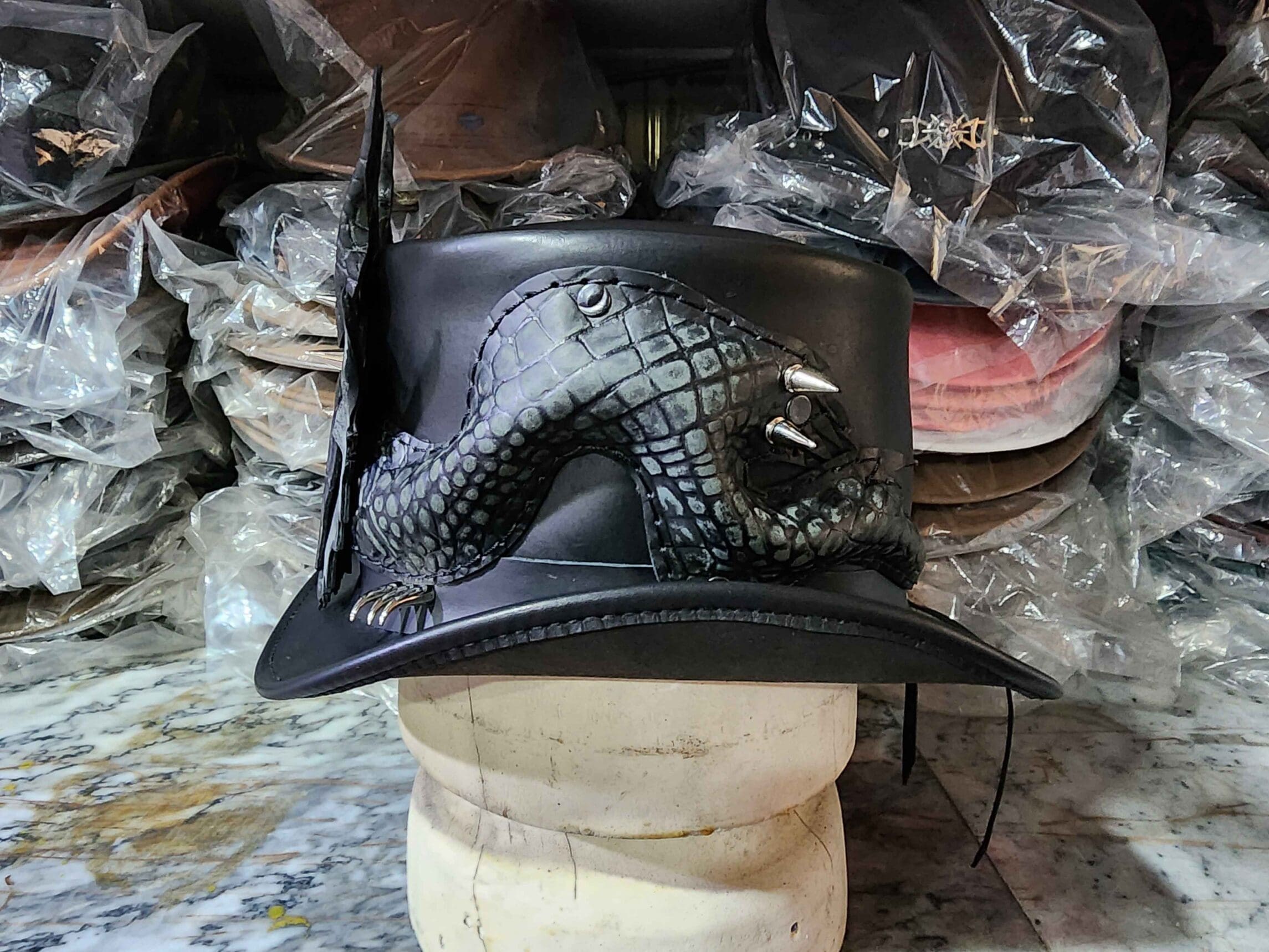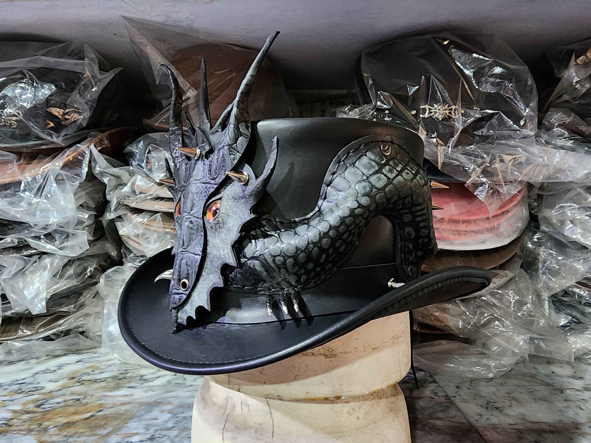 Introducing the epitome of artisanal craftsmanship and modern technology, behold the handmade Dragon of Charisma on a Leather Top Hat with Silver Metal Dragon Claws on the Hat Band.