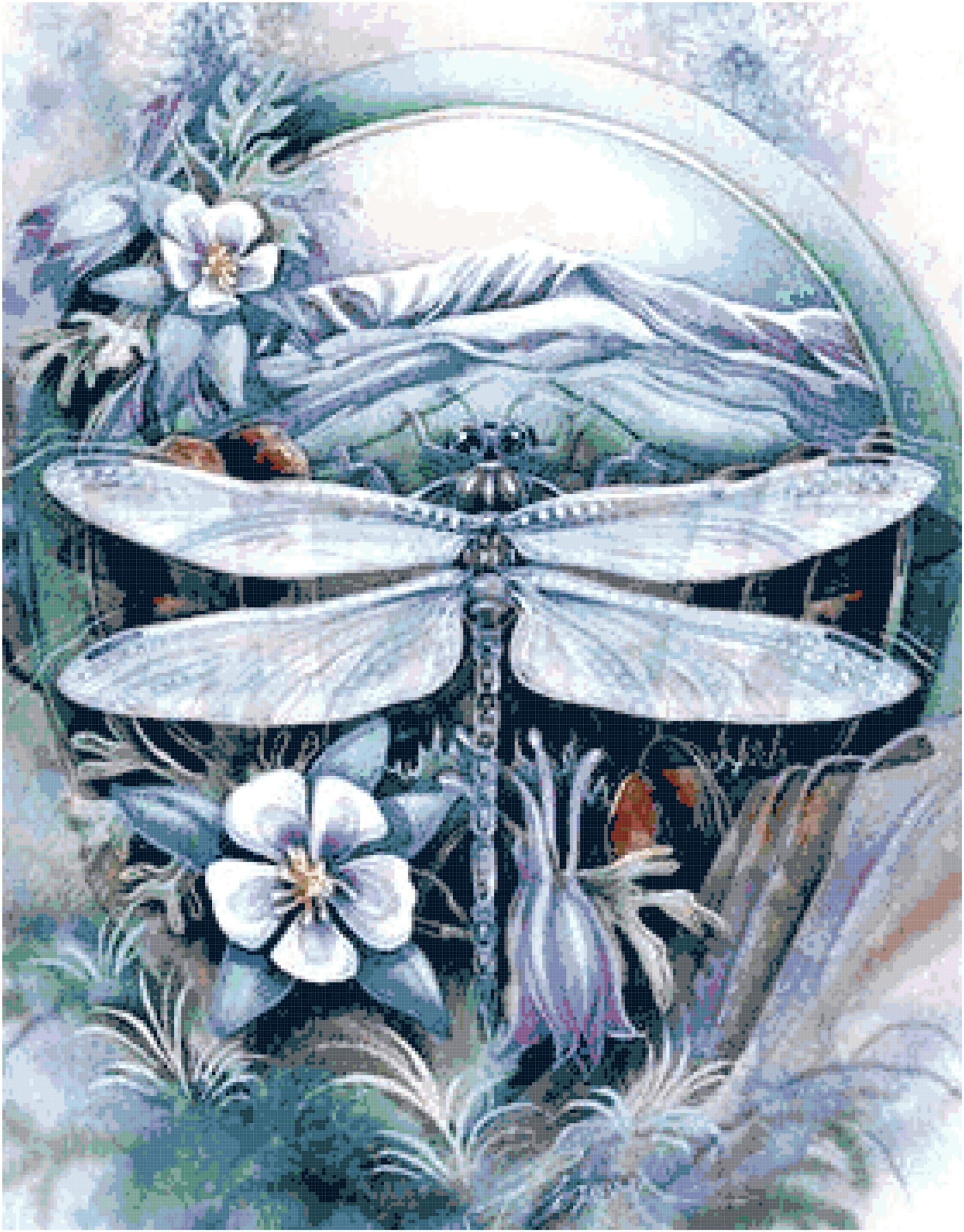 Dragonfly Wreath Cross Stitch Pattern – Large, full coverage pattern – 279 x 357 Stitches – 45 Colors