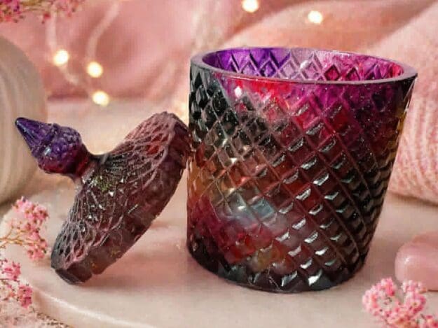 Multi color jar that features a diamond patterned exterior that sparkles in the light. Hand crafted with blends of purple, red, and blue colors of resin. A stunning decorative piece that blends artistry with sophistication.