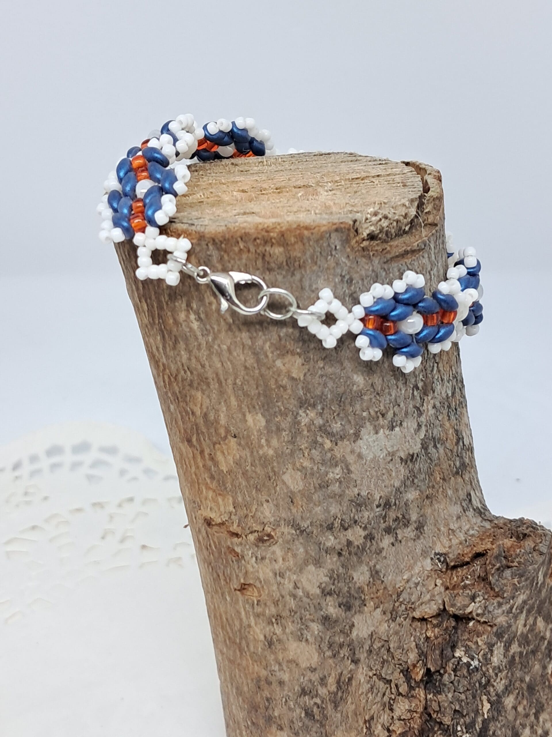 Handmade red. blue and white beaded bracelet with superduo beads, glass beads, and seed beads. Lightweight, elegant, and secured with a silver lobster clasp.