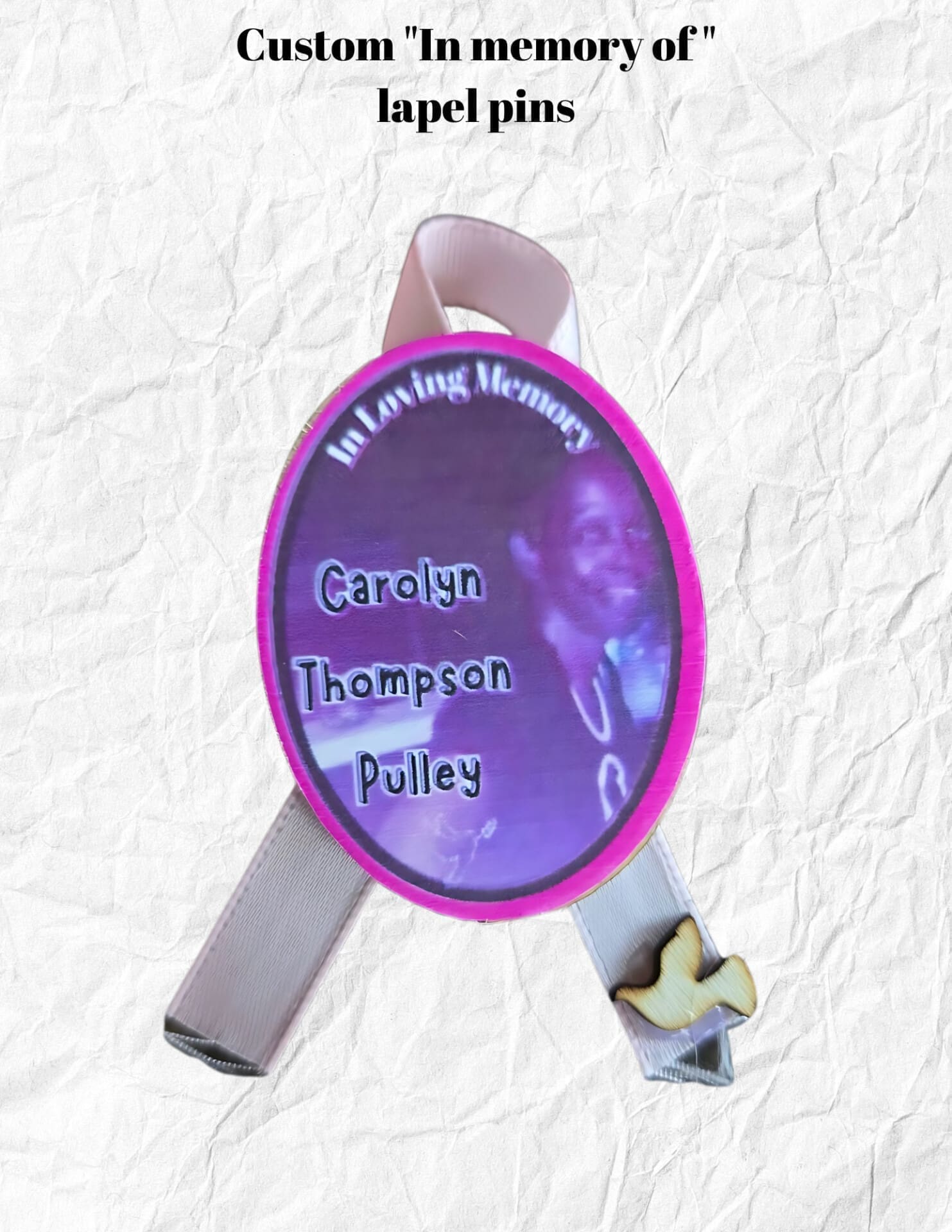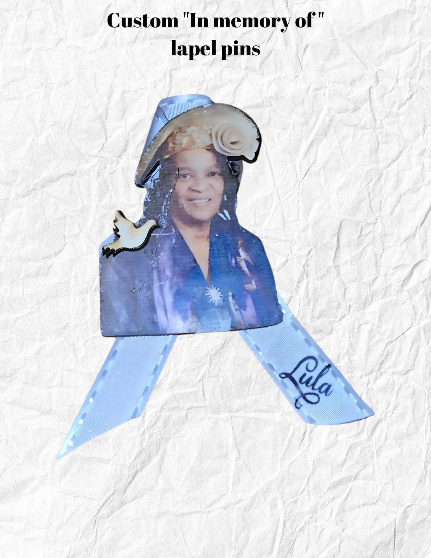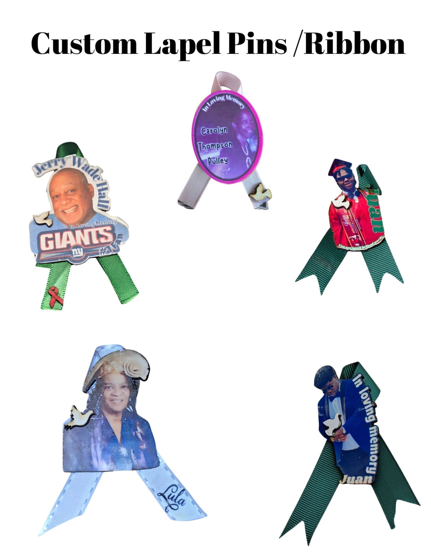 Memorial Exemplary Lapel Pins/Ribbons: Celebrate the life of someone dear with a personalized pin or ribbon featuring their photo, name, a heartfelt phrase, and meaningful elements like their favorite color, sports team, or an awareness ribbon. These keepsakes provide a touching way to remember and cherish their legacy during funerals and memorial services.