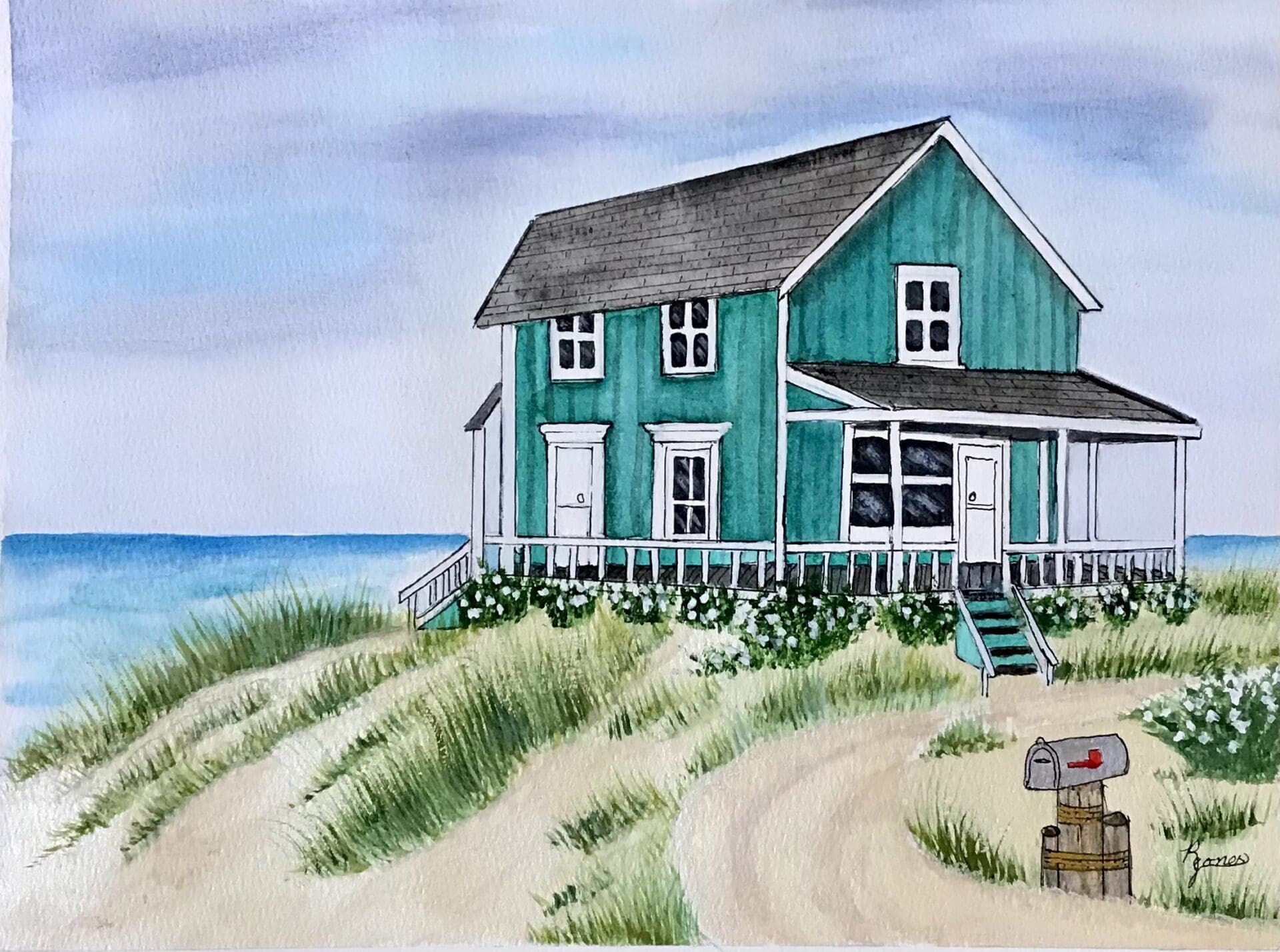 Measuring 9×12 inches, this intimate artwork portrays a charming turquoise house nestled on a sandy, grassy dune by the sea.