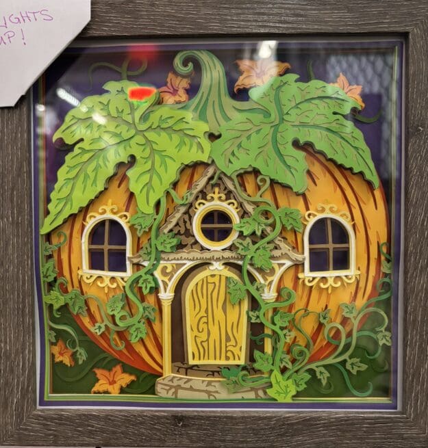This handmade pumpkin house shadow box is designed to bring warmth, charm, and imagination into your space. Featuring a glowing pumpkin cottage surrounded by curling vines, oversized leaves, and layered architectural details, this shadow box creates a magical focal point that feels both cozy and playful. The built in lighting enhances the depth of each layer, allowing the pumpkin house shadow box to truly come alive when illuminated.