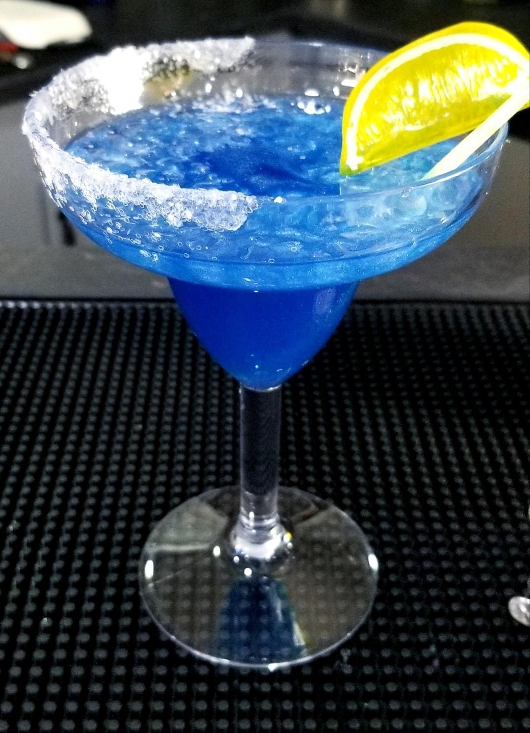 Glass is half rimmed with “sugar” (white glitter). Garnished with 2 stirrers and a lemon wheel.