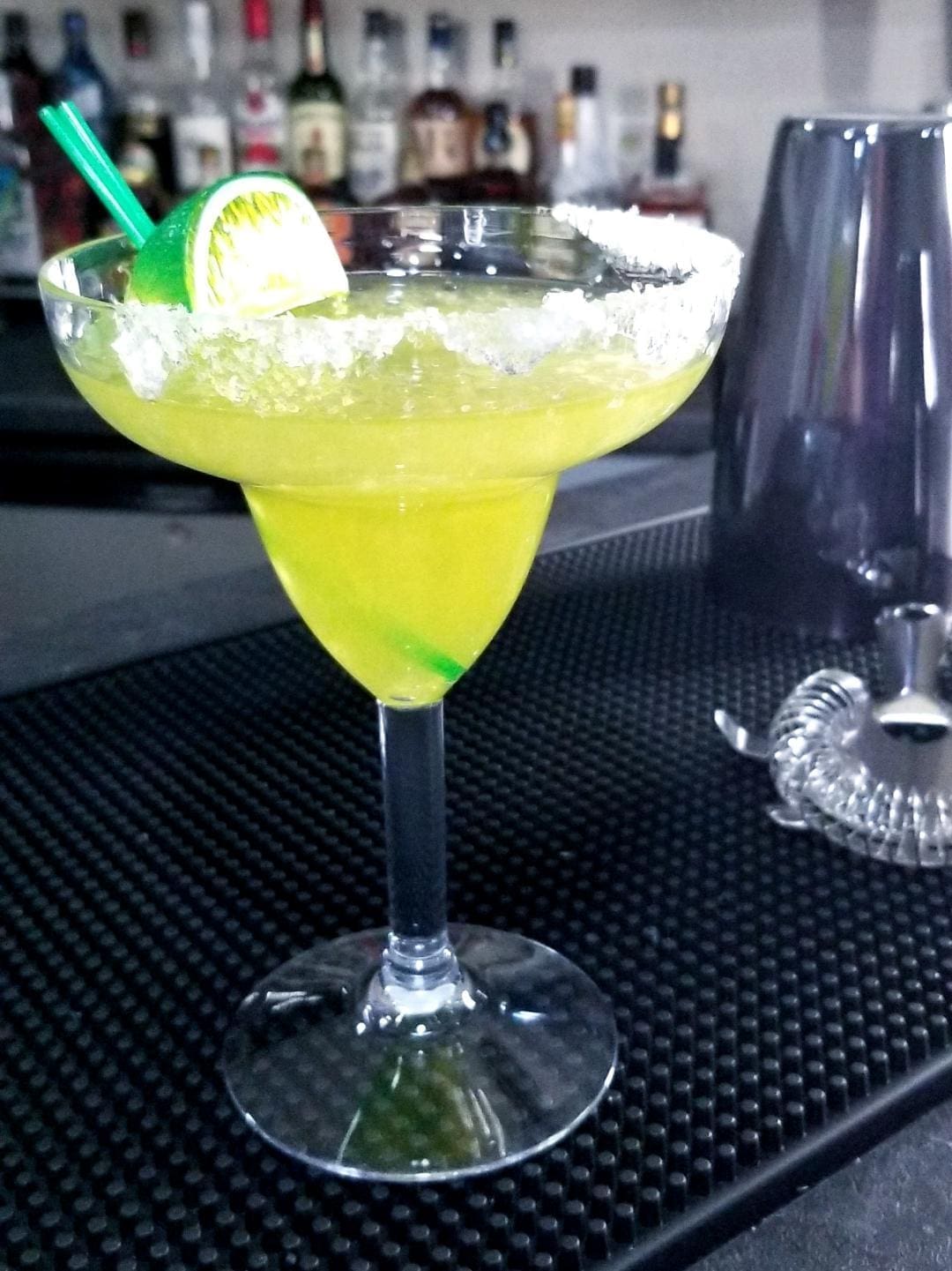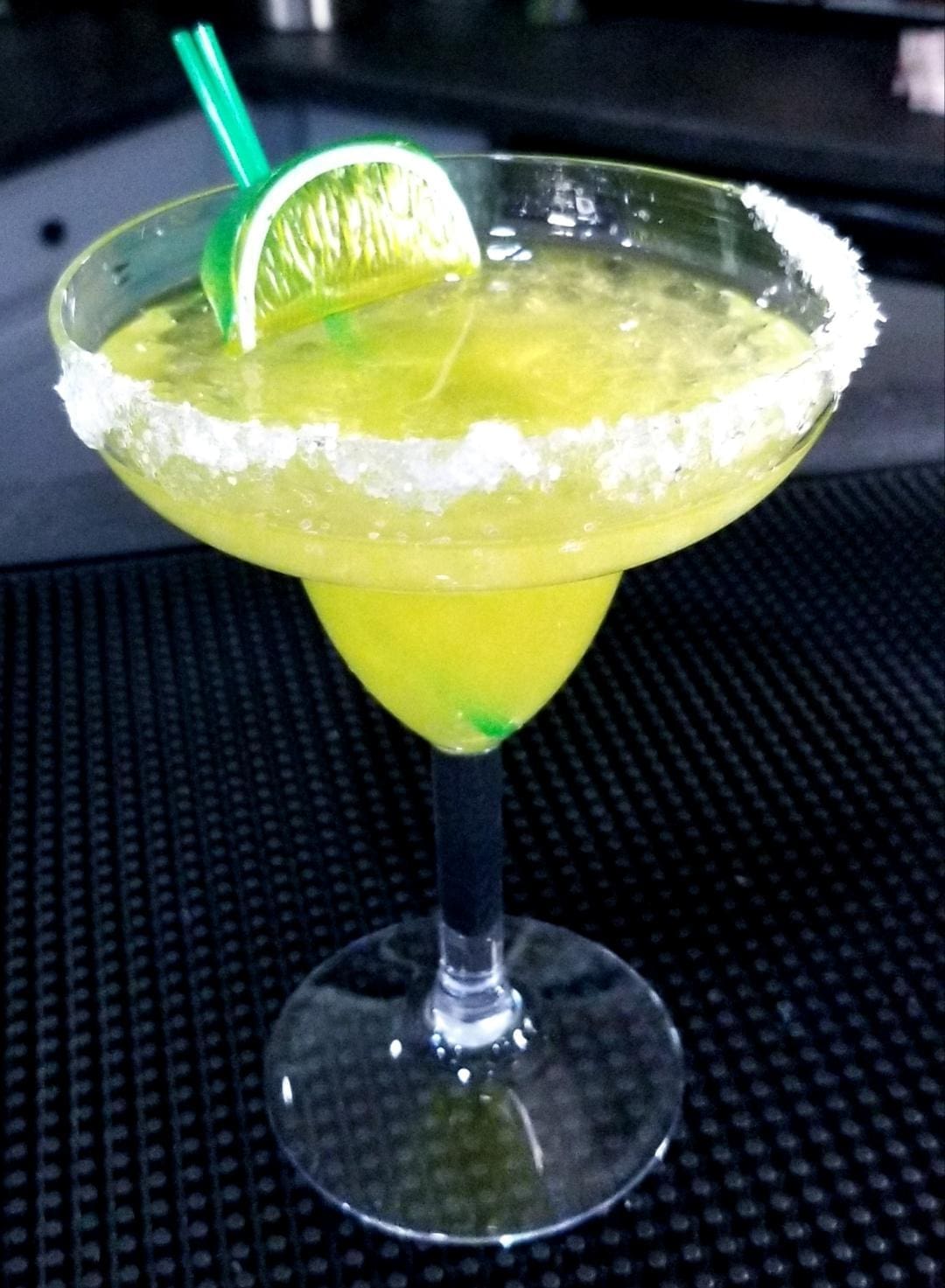 Glass is half rimmed with “salt” (rock salt & white glitter). Garnished with 2 stirrers and a lime.